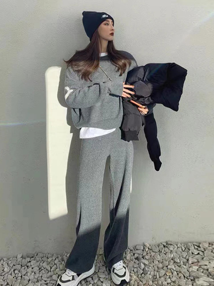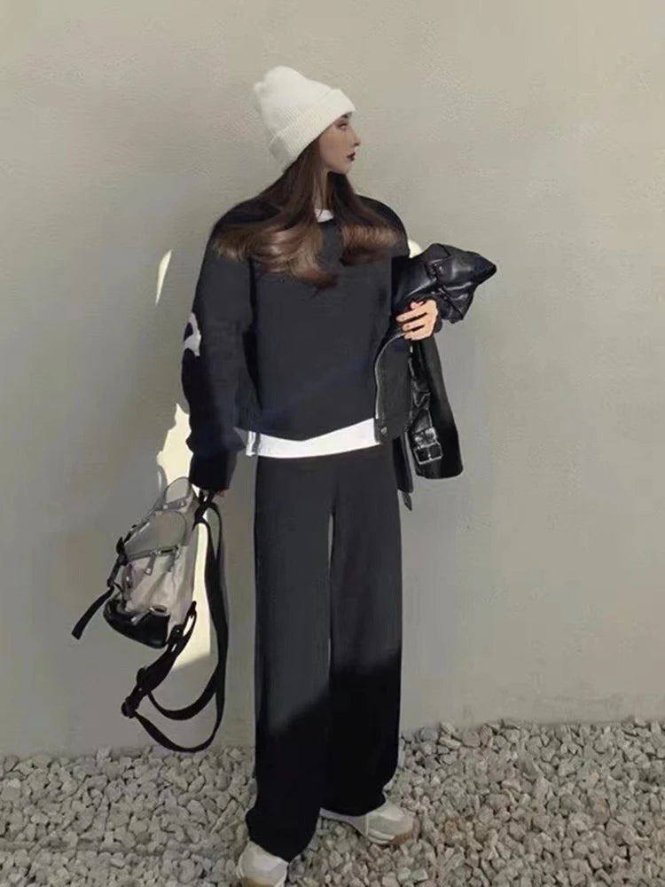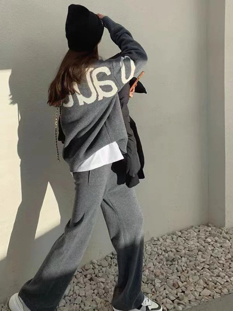 2Pcs Casual Knitted Wide Leg Pant Suit Women's Personality Letter Printing Versatile Loose Long Sleeved O-Neck Pullover Sweater