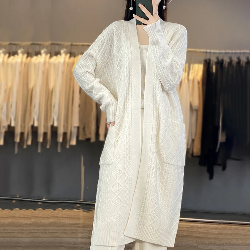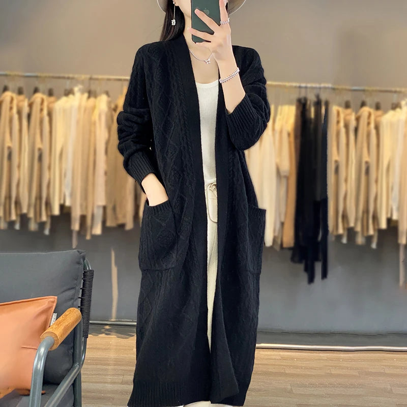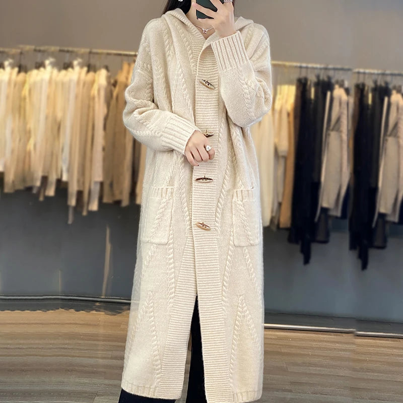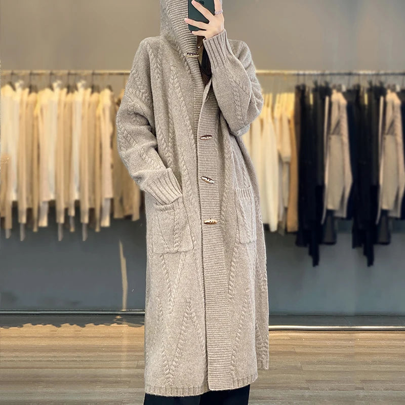 Autumn And Winter New Cashmere Cardigan Women's 100% Pure Wool Coat Loose Hooded Long Horn Button Knitted Sweater