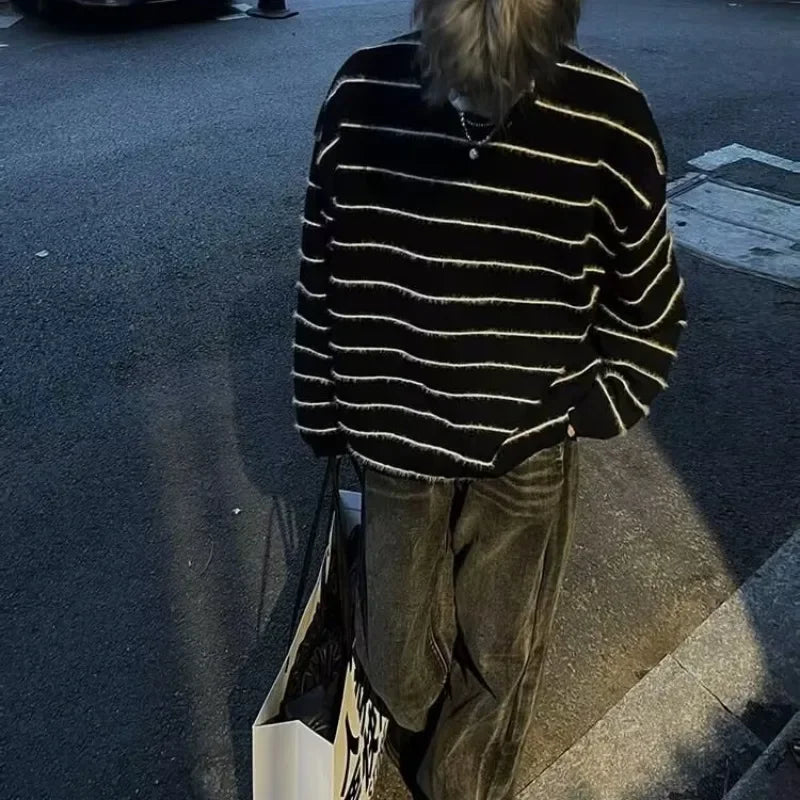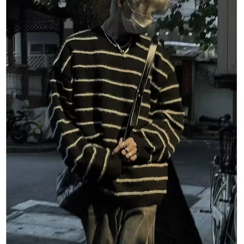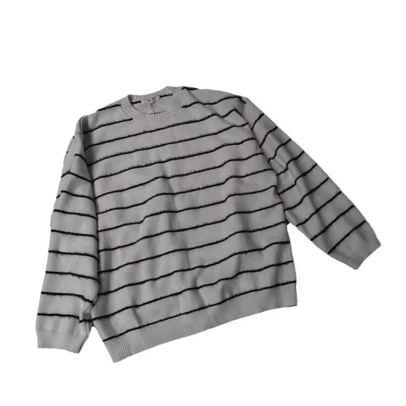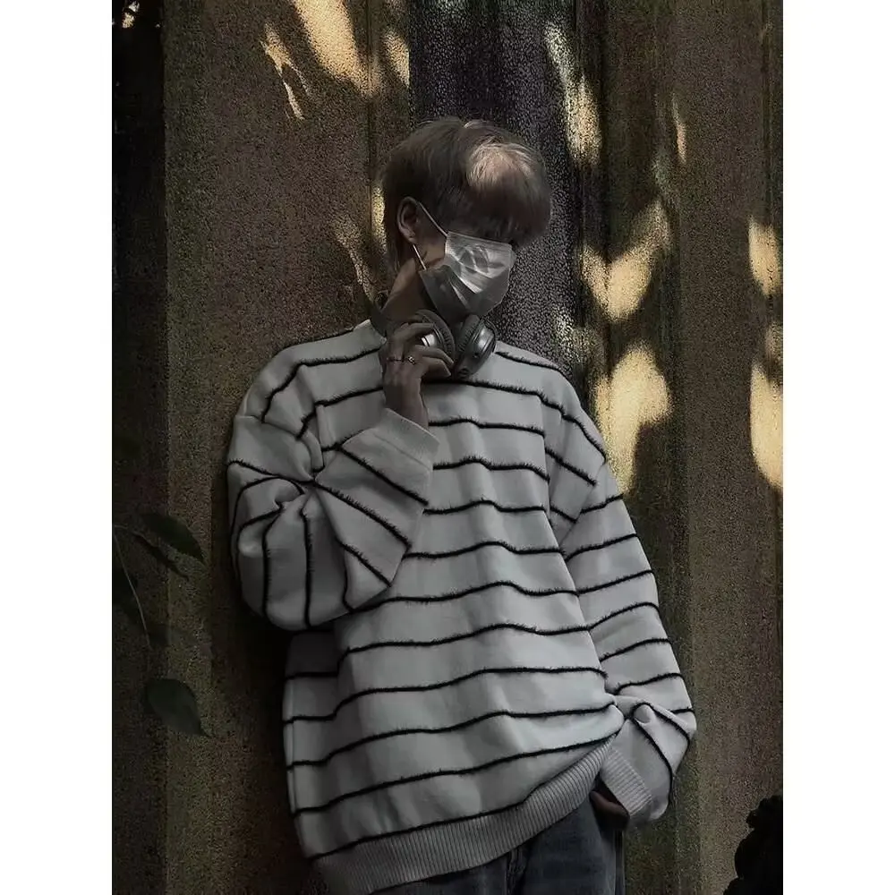 DERMEARNE Black White Striped Casual O-neck Sweater Men Women Loose Fit Knitwear Pullovers Winter Japanese Vintage Knitted Pullover Tops