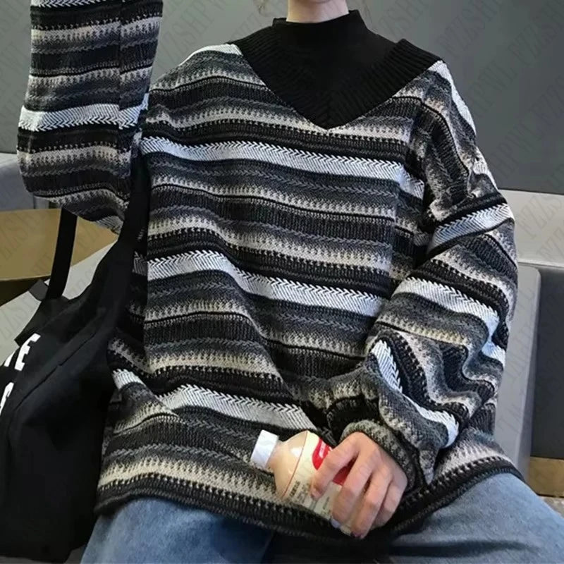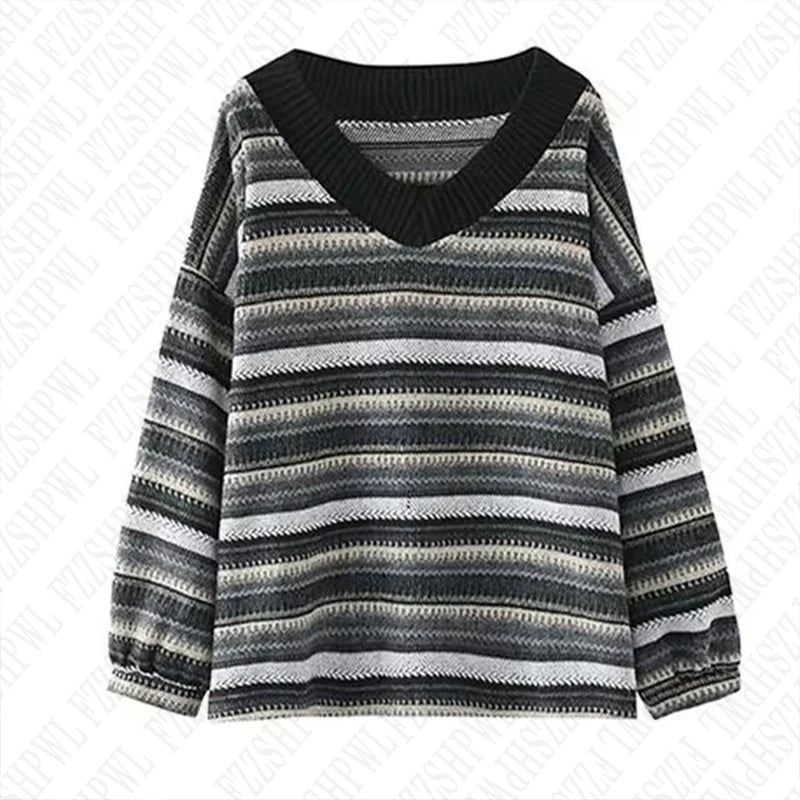 Casual stripe pattern knitted sweater V-neck 90S tops emo girl urban street beauty punk high street retro hop silm women sweater