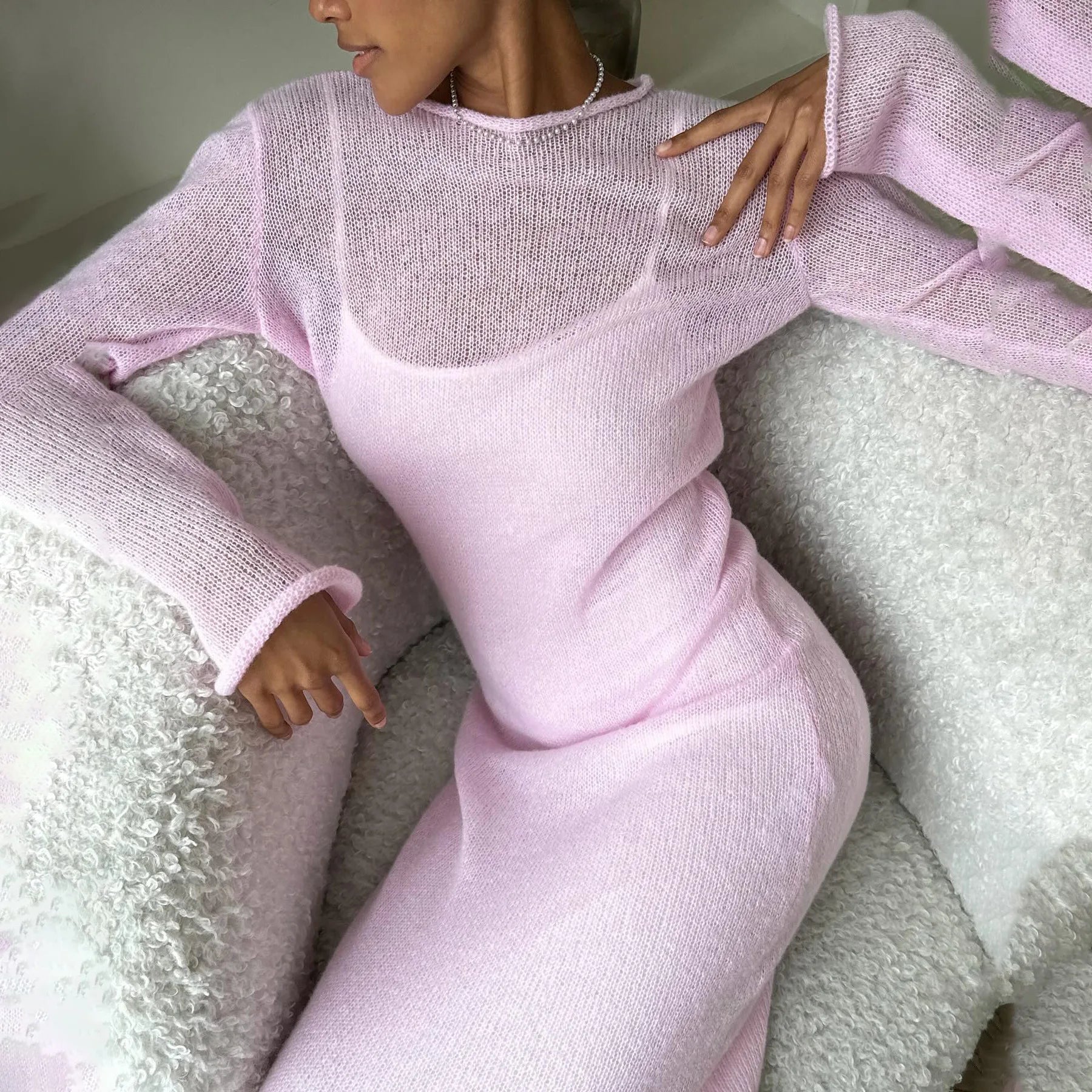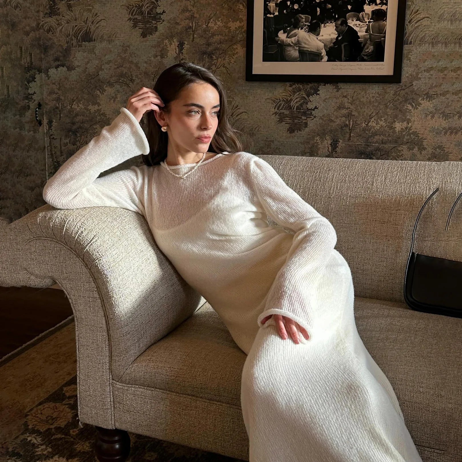 DERMEARNE DSMTRC Women 2024 Elegant Chic Soft Lady Hollowing Sweater Dresses Femme New Spring Autumn O-Neck Elastic Knit Long Dresses