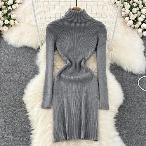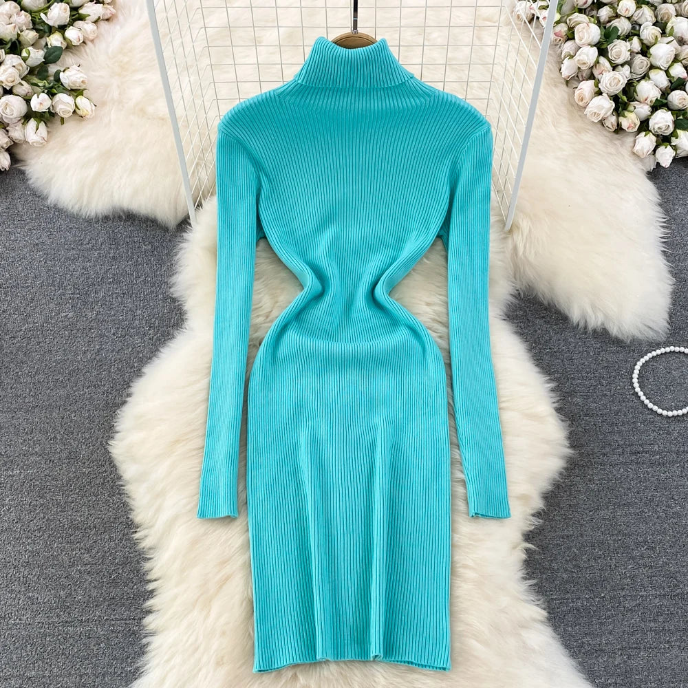 DERMEARNE Elegant Turtleneck Long Sleeve Knit Bodycon Pencil Dress Slim Basic Fashion Sweater Vestido Sexy Women Autumn Winter Clothing