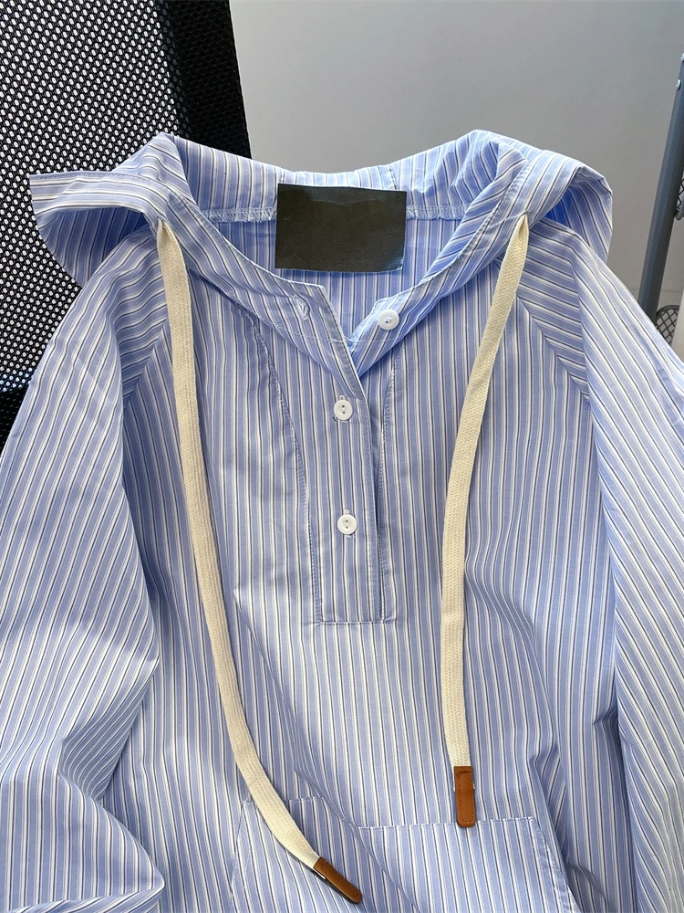 DERMEARNE Japanese Style Blue Stripe Hooded Shirts Women Man Spring Autumn Long Sleeves Loose Casual Hoodies Vintage All-matched Coat Tops