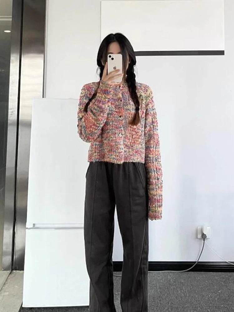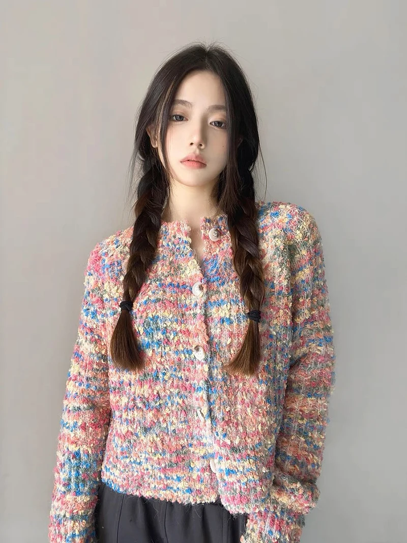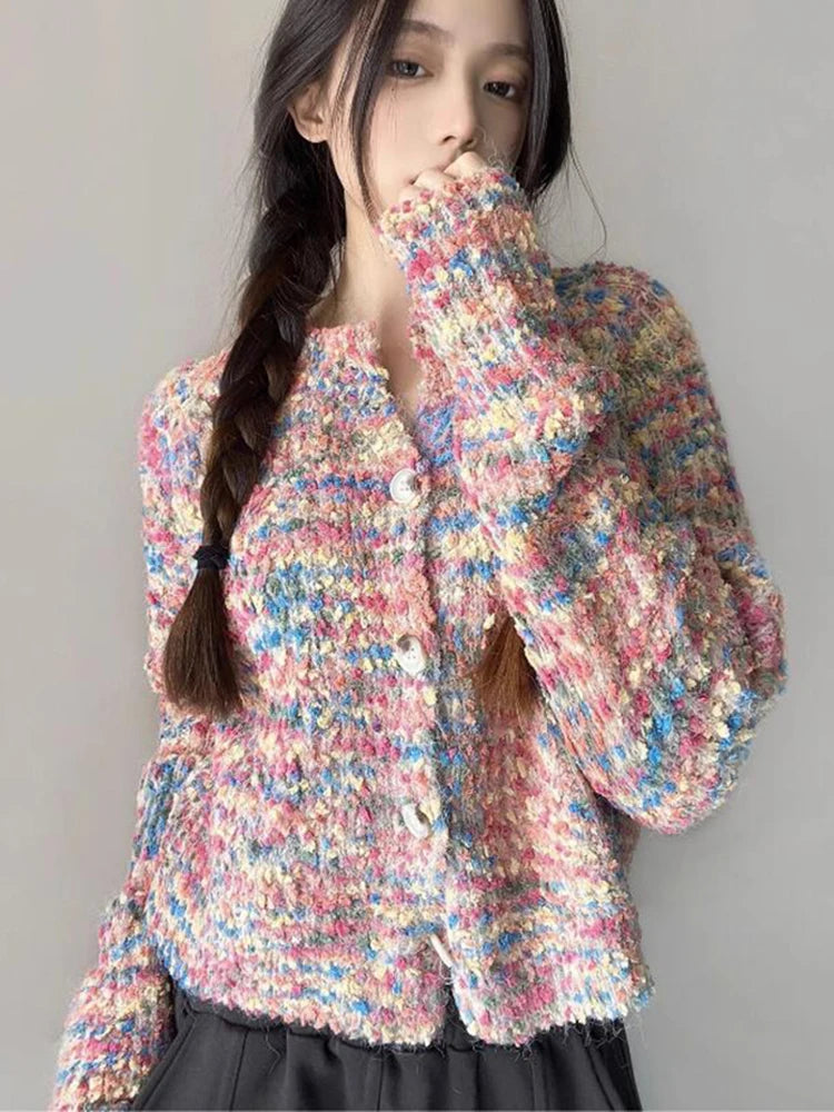 DERMEARNE Jmprs Korean Fashion Rainbow Cardigan Women Sweet Long Sleeve Knitting Sweaters Elegant Loose Buttons Autumn Lady Cardigan Coat