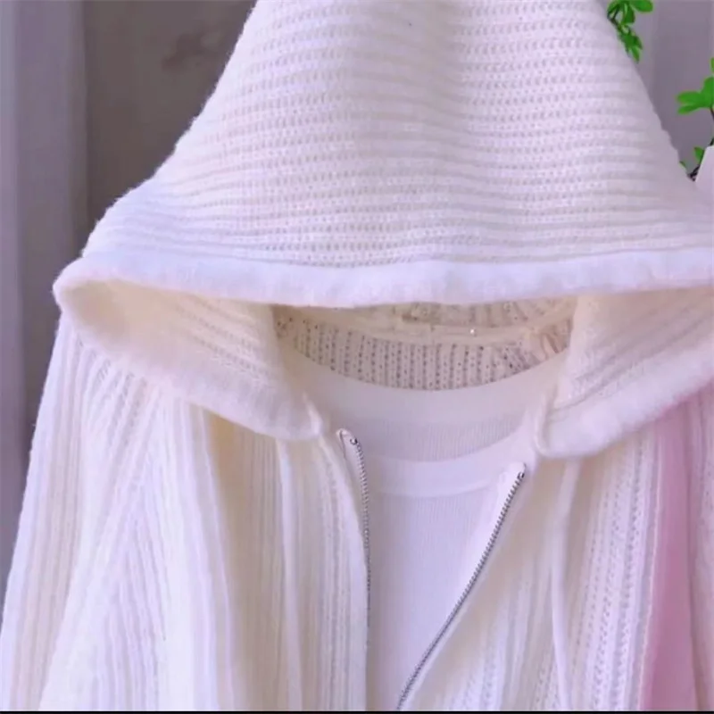 DERMEARNE Pink Hooded Knitted Cardigan For Women's Autumn New Loose And Stylish Design Striped Short Sweater Zipper Jacket White Overcoat