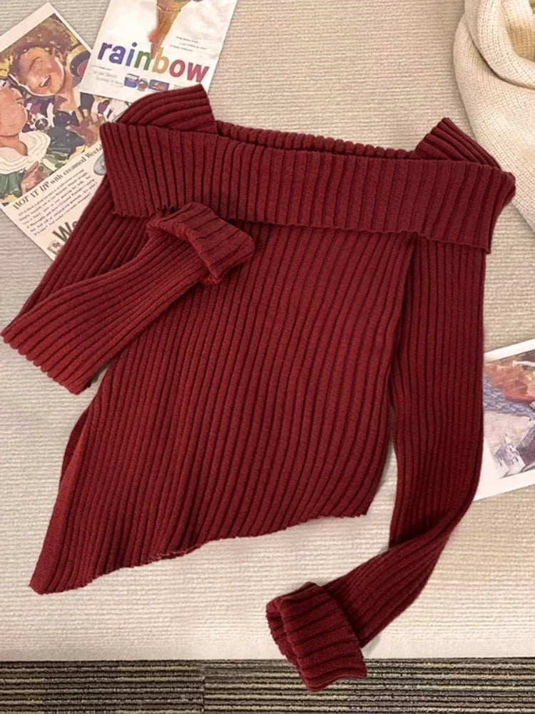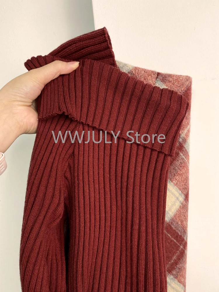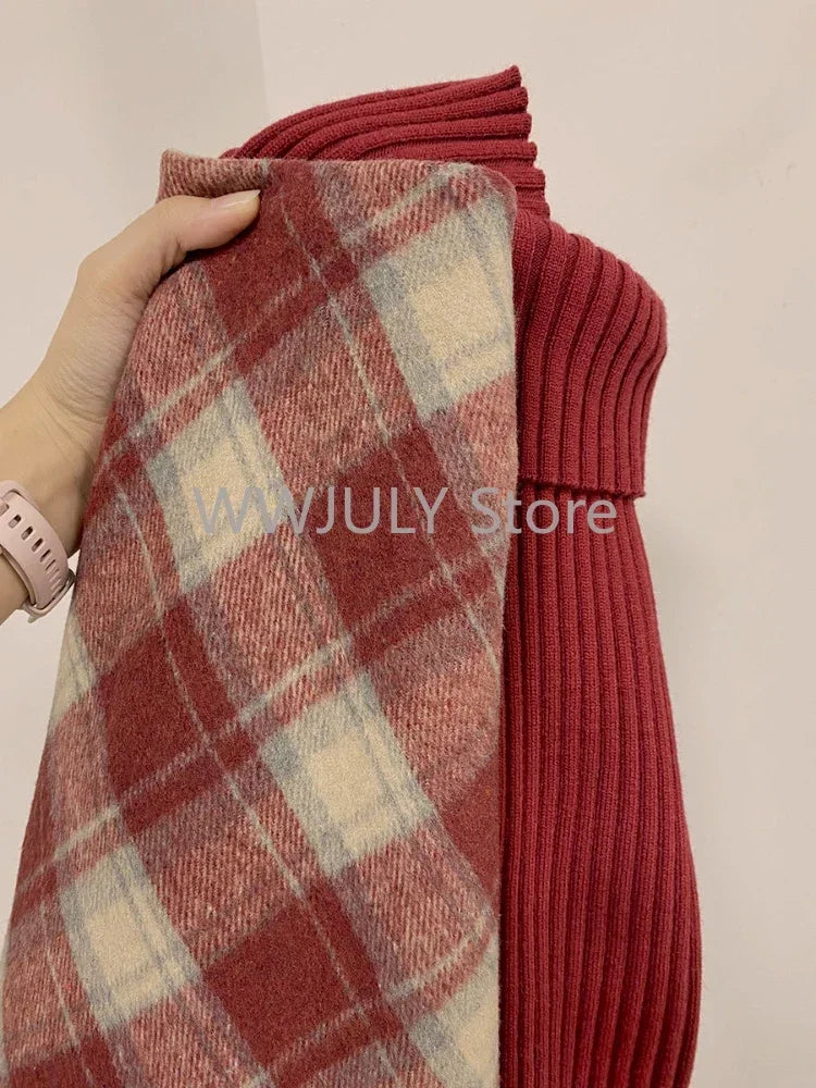 DERMEARNE Woman Harajuku Korean Fashion Suit Autumn Winter Red Irregular Knitted Sweater + High Waist Slim Y2k Mini Skirt Plaid Skirt Set