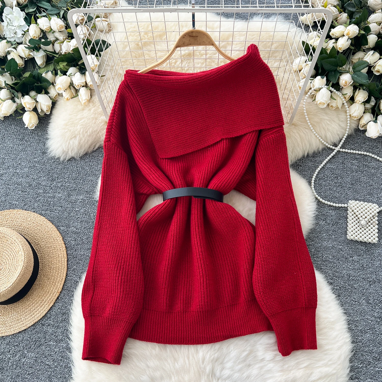 DERMEARNE Women Knitted Sweater Autumn Winter Sexy Off Shoulder Lapel Slim Pullover Tops Female Solid Long Sleeve Korean Casual Sweaters