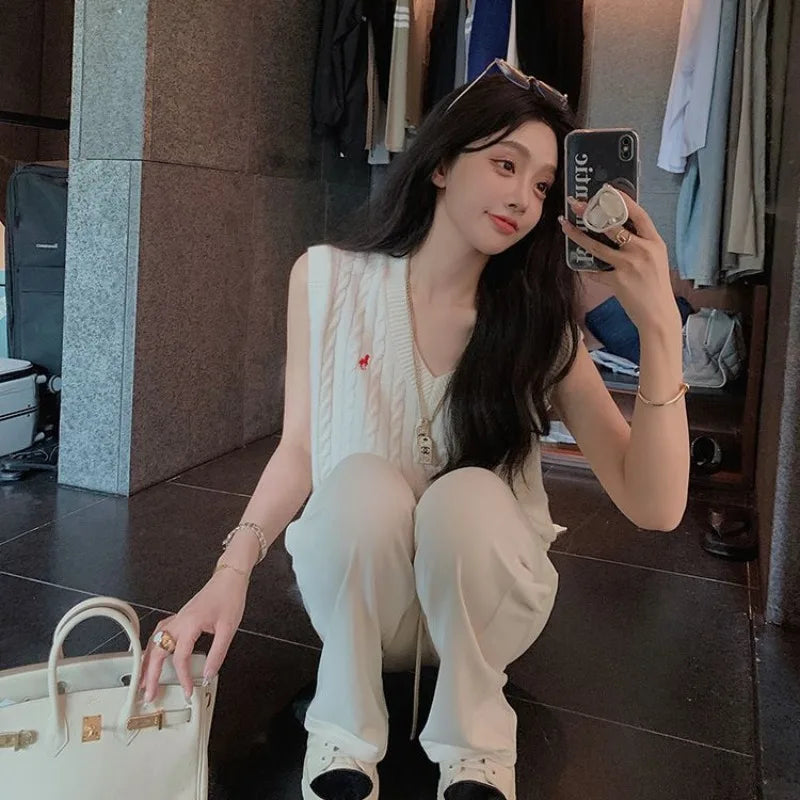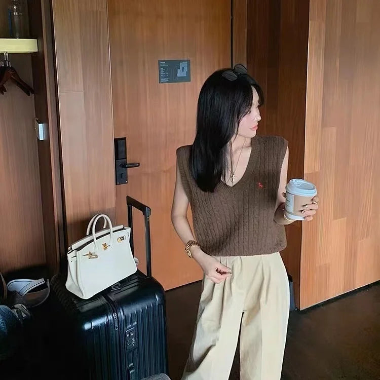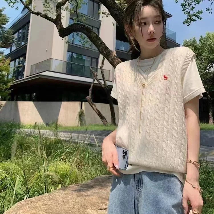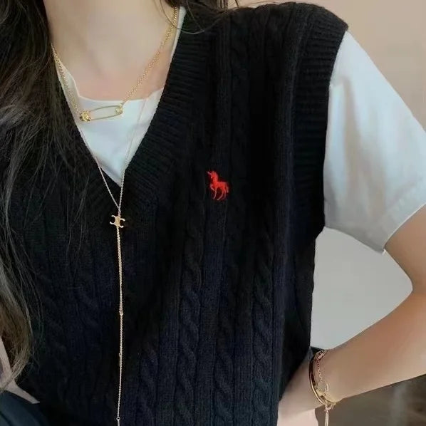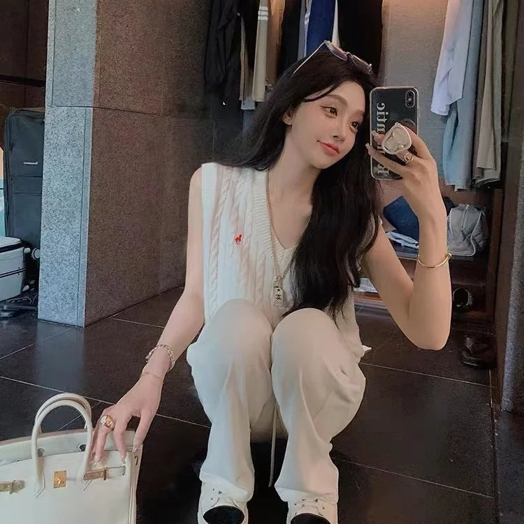 Embroidered V-neck Sweater Knit Vest Women 2024 Fashion Autumn Loose Knitted Outerwear Vintage Solid Sleeveless Female Top Warm