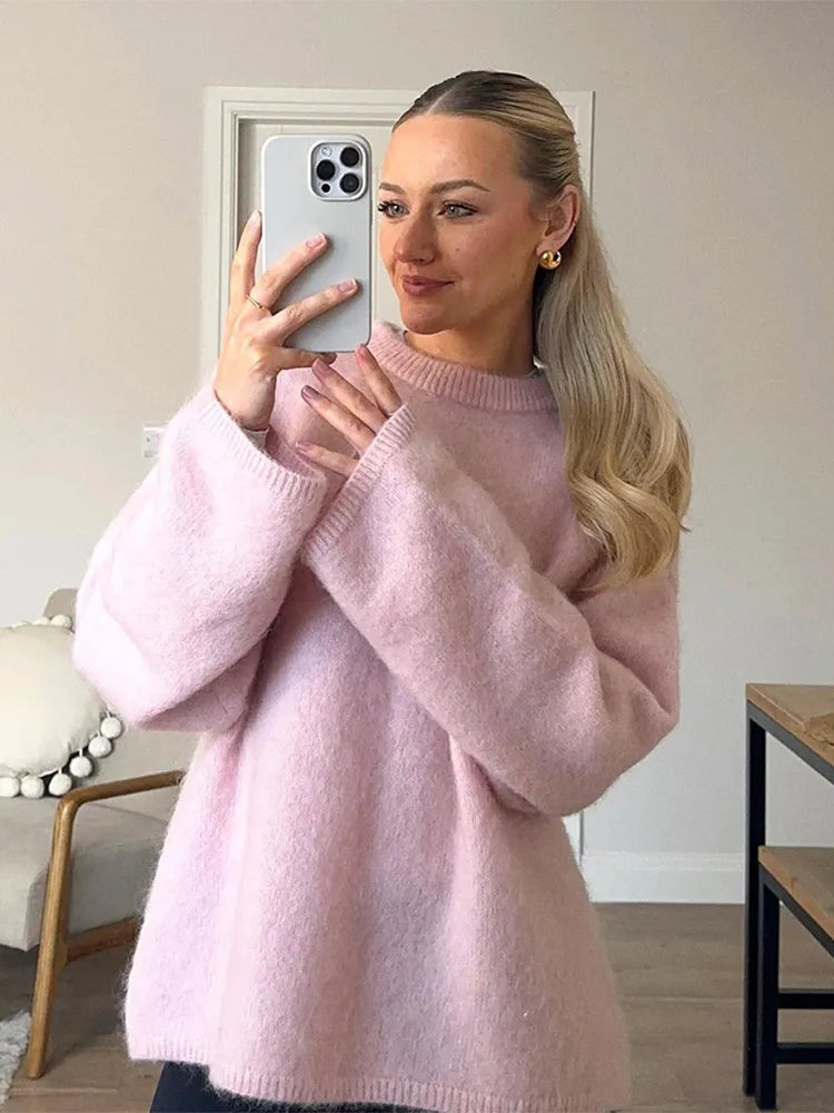 Pink Cashmere Woolen Loose O Neck Knitted Pullover 2024 New Solid Loose Long Sleeve Knit Sweaters Autumn Winter Streetwear Pull