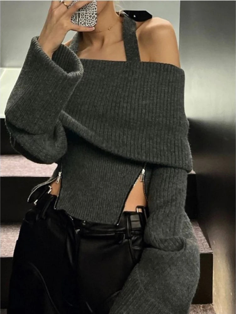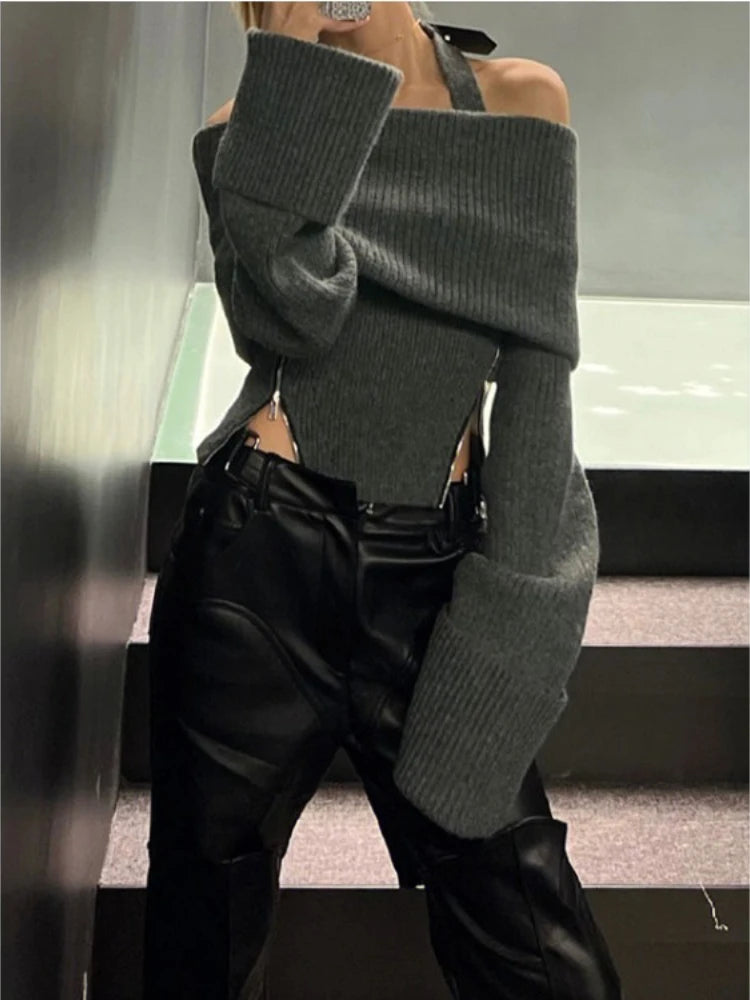 Slash Neck Women Ins Vintage Halter Sweaters Fashion Y2k Aesthetic Knitted Solid Jumpers Sexy Slim Zipper Chic Layered Pullovers