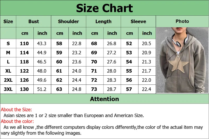 Vintage Star Patch Hoodies Women Harajuku Punk Gothic Loose Hooded Sweatshirt Male Hip Hop Long Sleeve Zipper Jacket Y2K Clothes