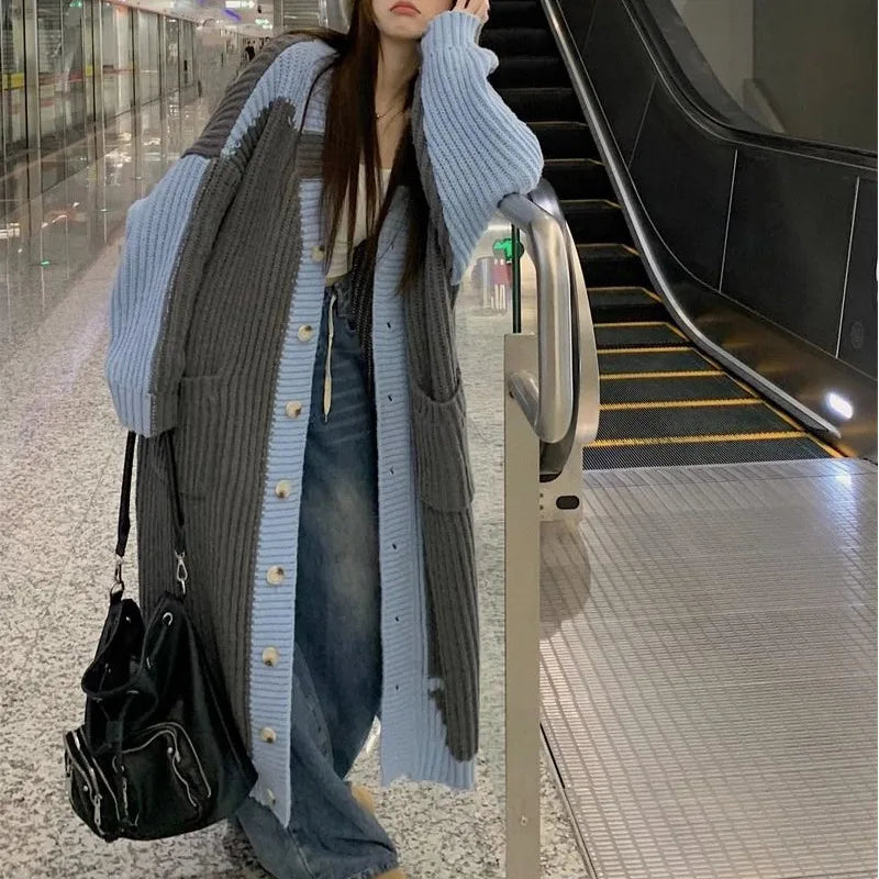 Women Stitching Color Thick Warm Long Sweater Cardigan Autumn Single-breasted Pocketed Knitted Coat Female Loose Casual Top