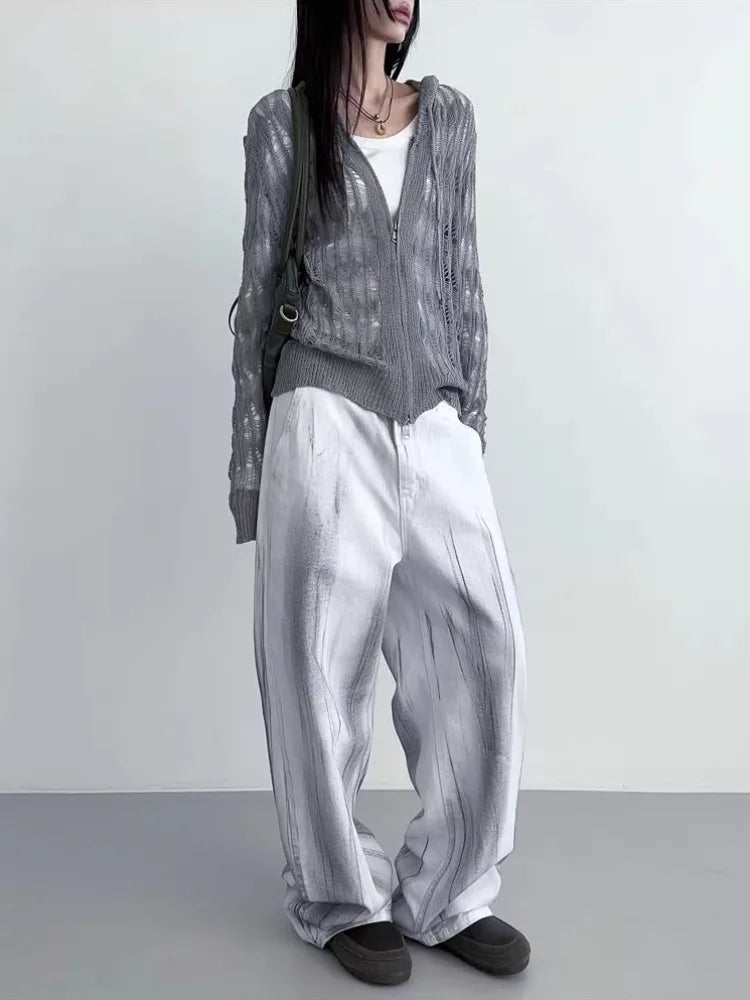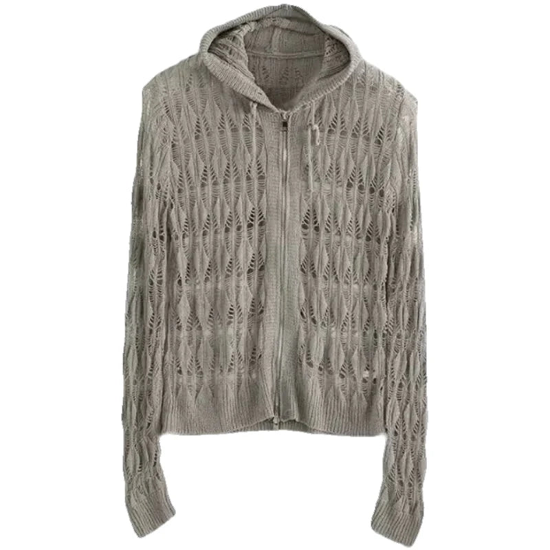 Zip Up Hooded Cardigan Women Japanese Y2k Style Hollow Crop Sweater Vintage Gray Thin Knitted Long Sleev Tops
