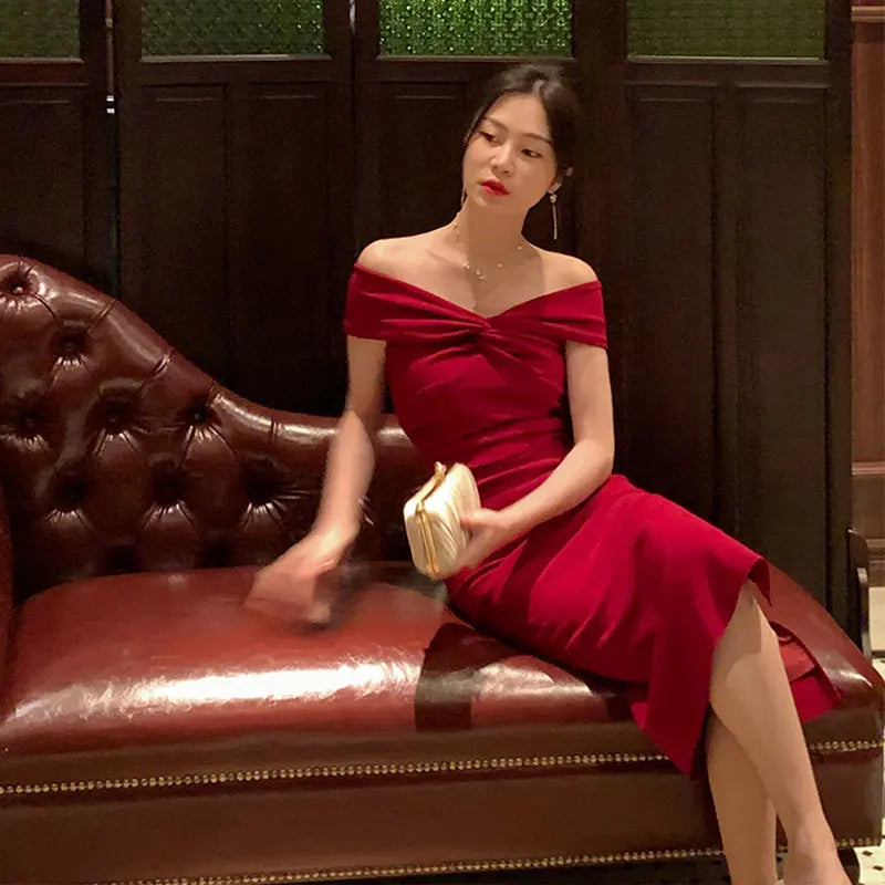 DERMEARNE 2025 French Elegant Women Wedding Party Dress Fashion Vintage Slash Neck Sheath Robe Female Sundress Retro Evening Dress Vestido