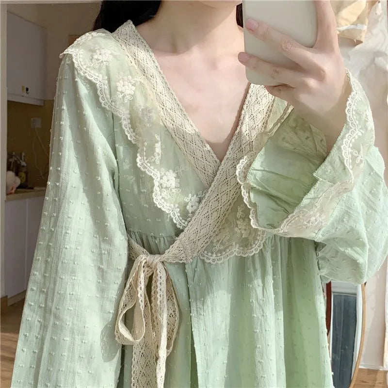 DERMEARNE 2025 New V-neck Tied Pajama Set for Women Spring Autumn Tops Long Sleeved Pants Lace Lace Pajamas