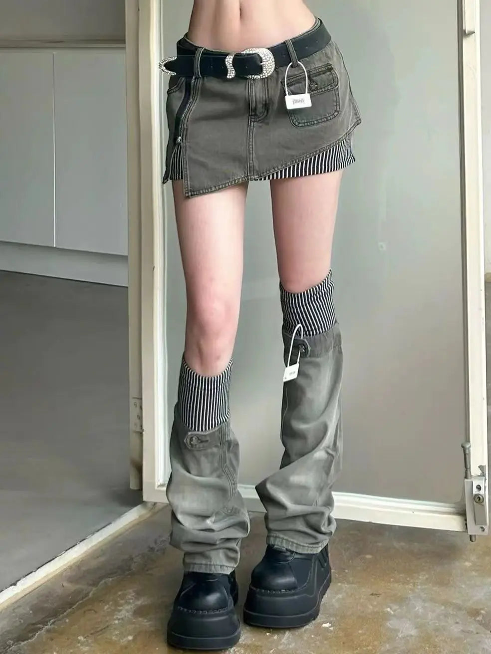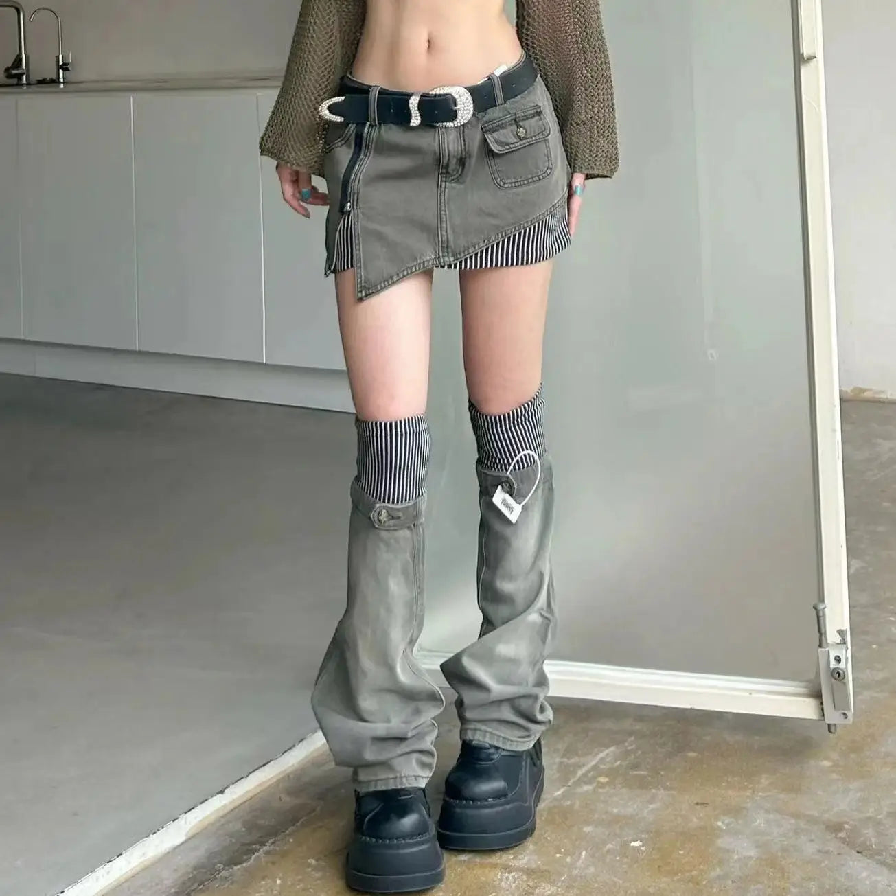 DERMEARNE American retro patterned patchwork denim suit half skirt women Y2K irregular short skirt leg cover two-piece set for wearing