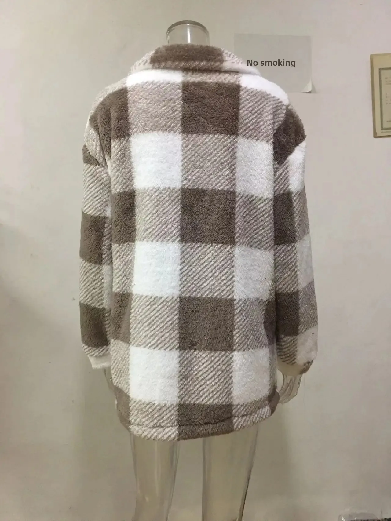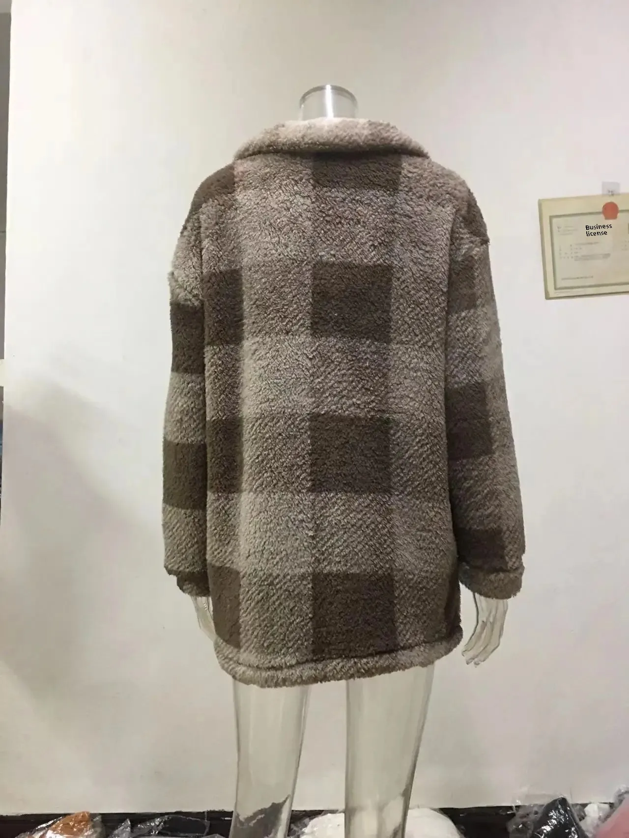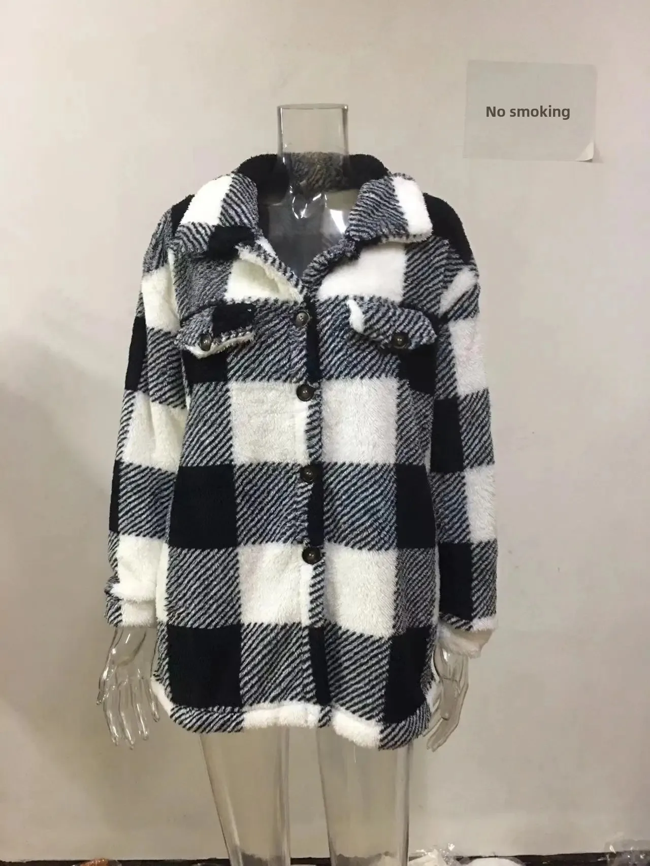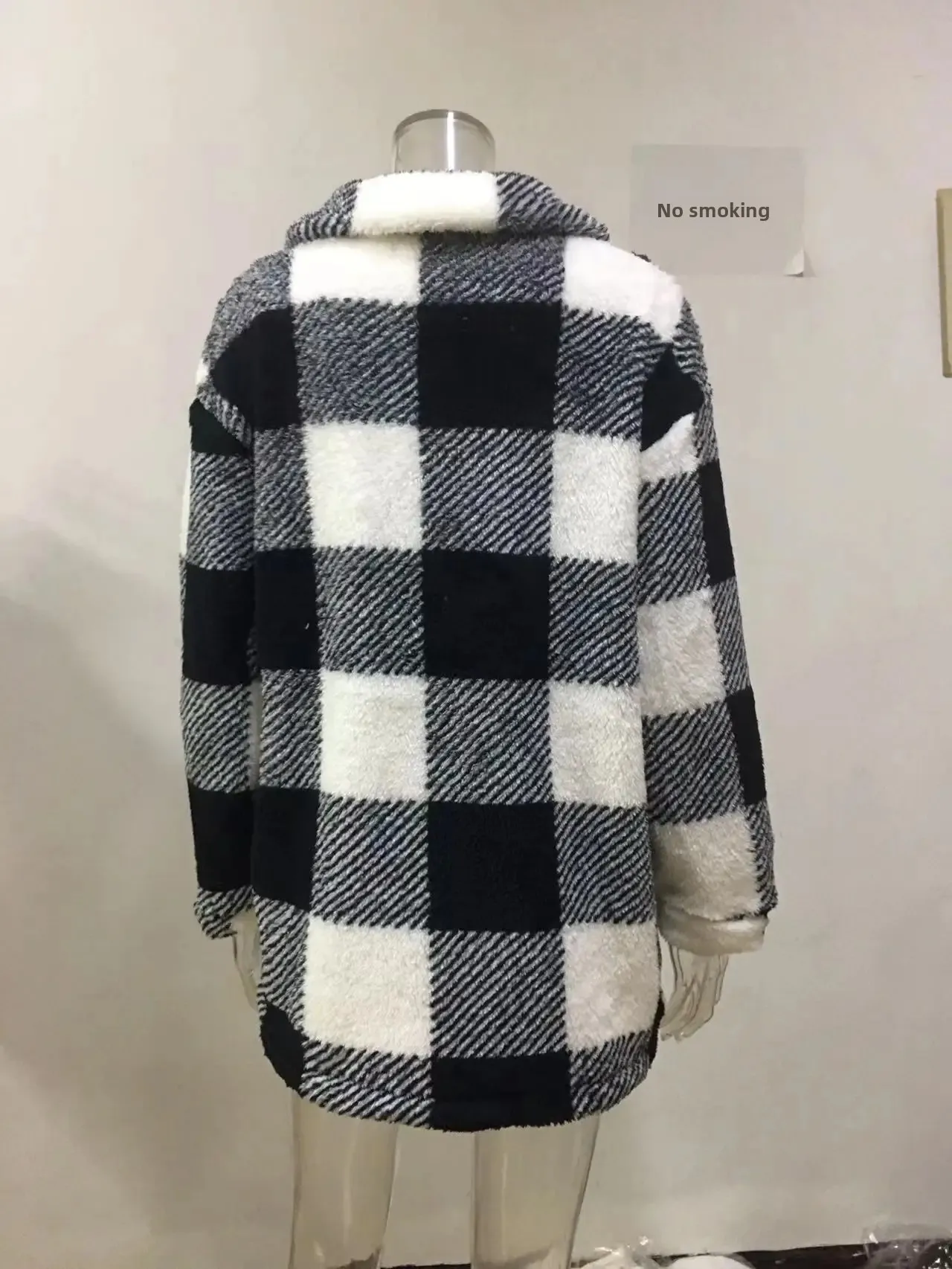 DERMEARNE Autumn Winter Women's Thickened Plaid Lamb Velvet Jacket with Pockets Buttoned Fluffy Outerwear Casual Loose Fit Coat