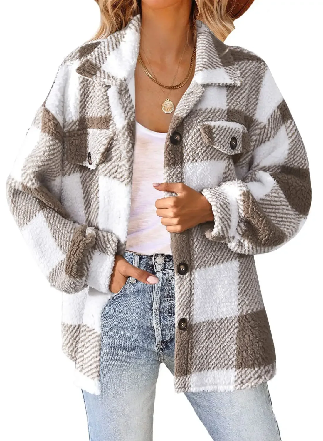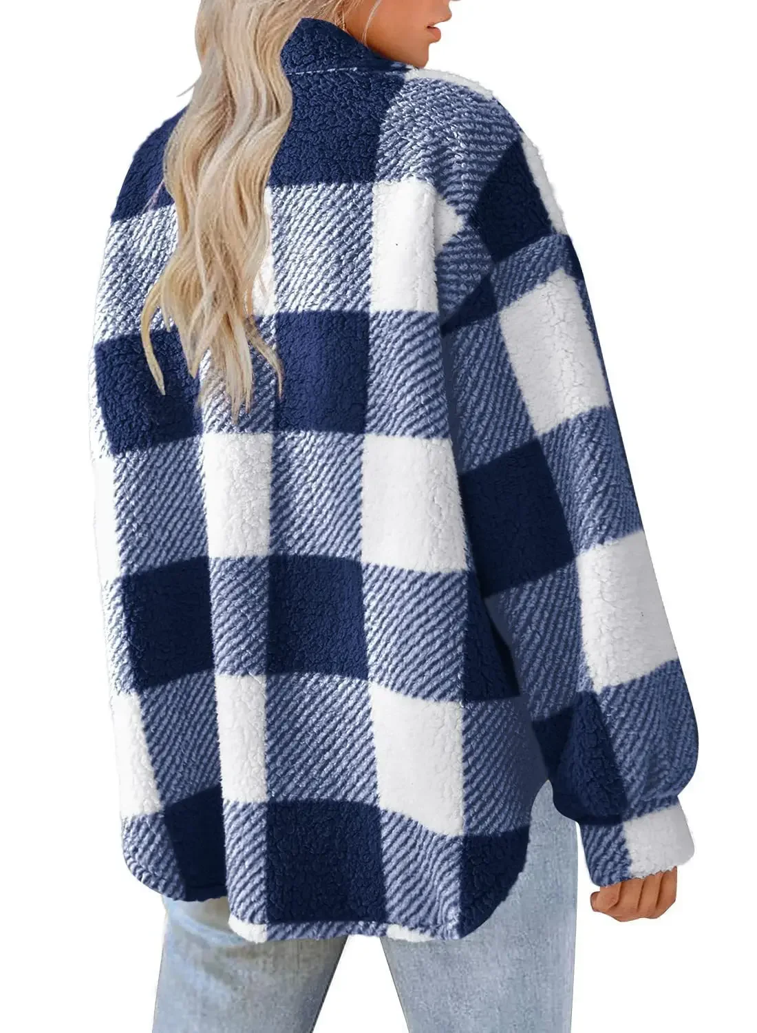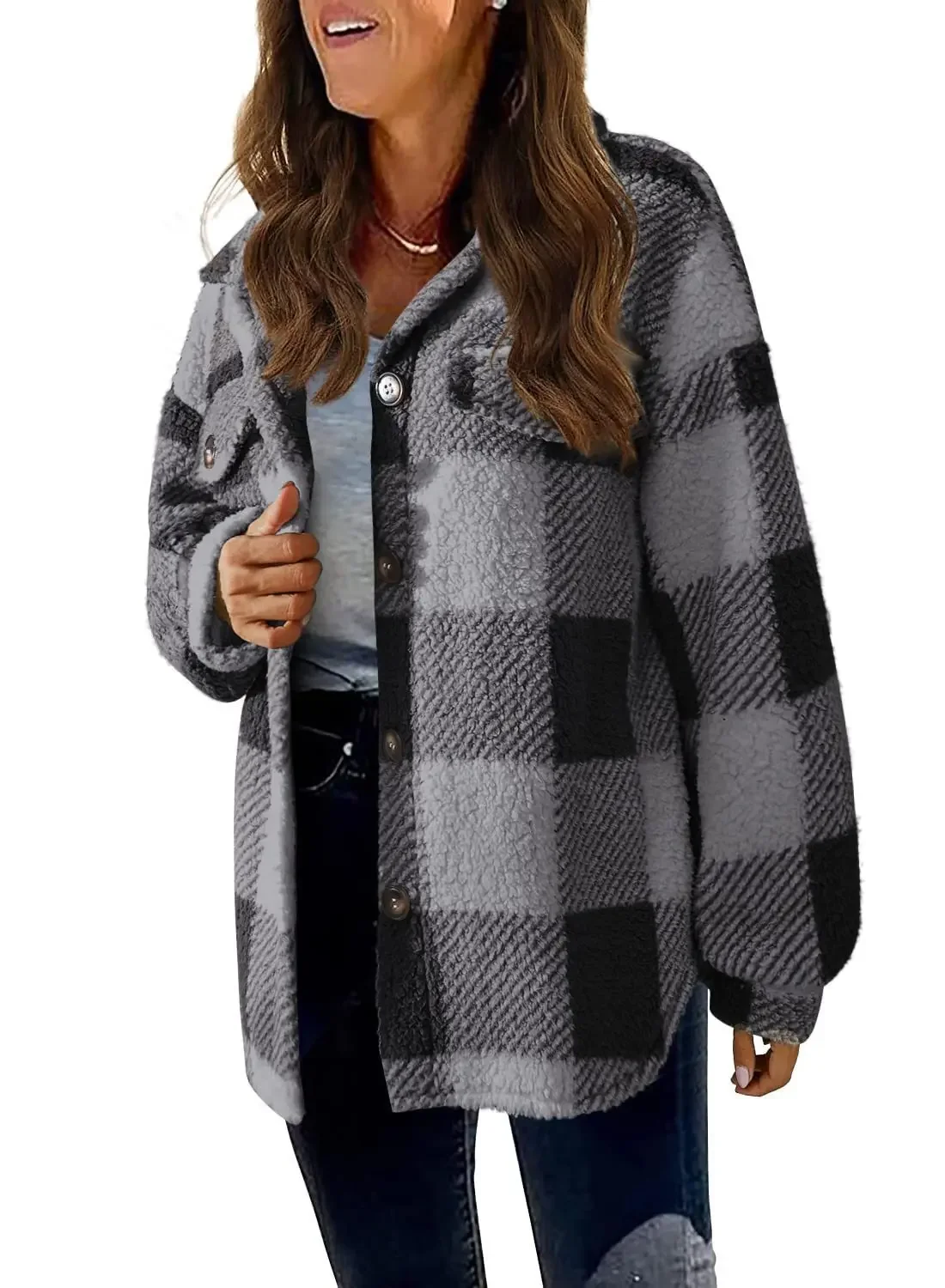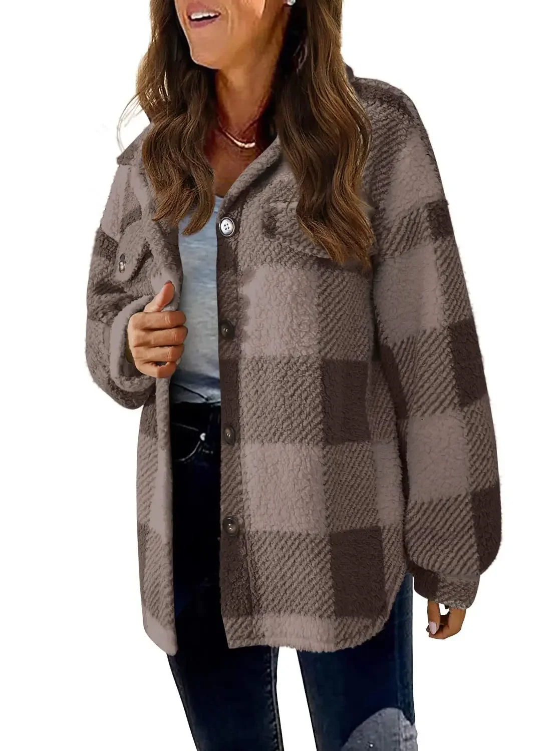 DERMEARNE Autumn Winter Women's Thickened Plaid Lamb Velvet Jacket with Pockets Buttoned Fluffy Outerwear Casual Loose Fit Coat