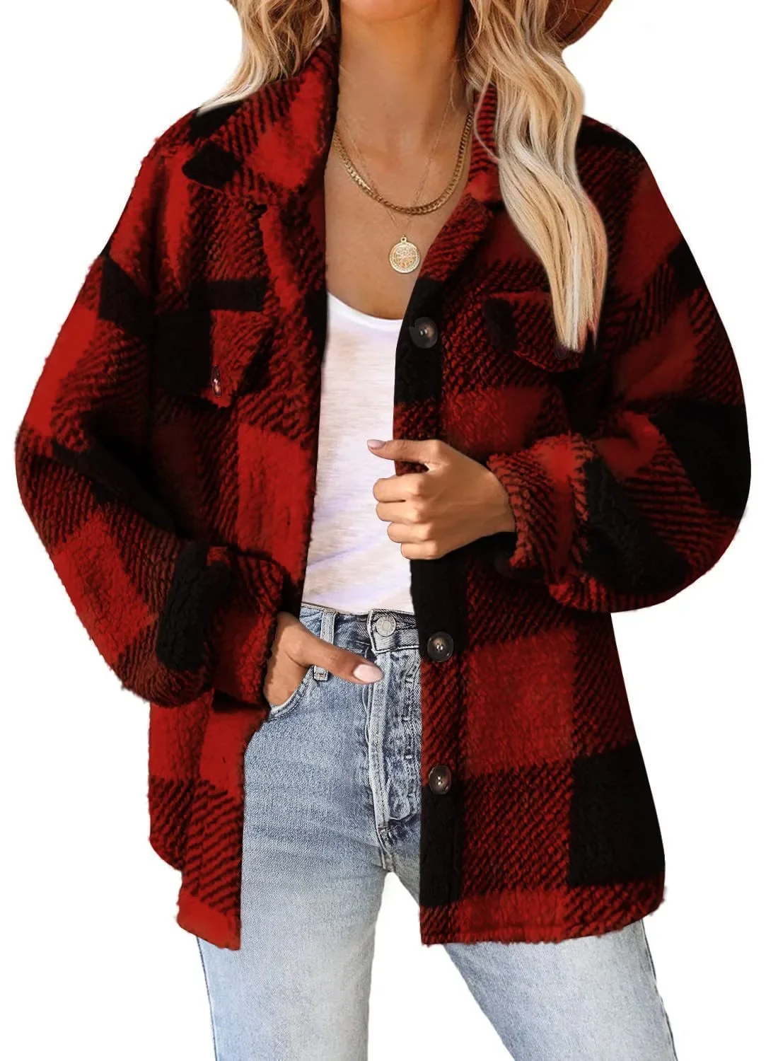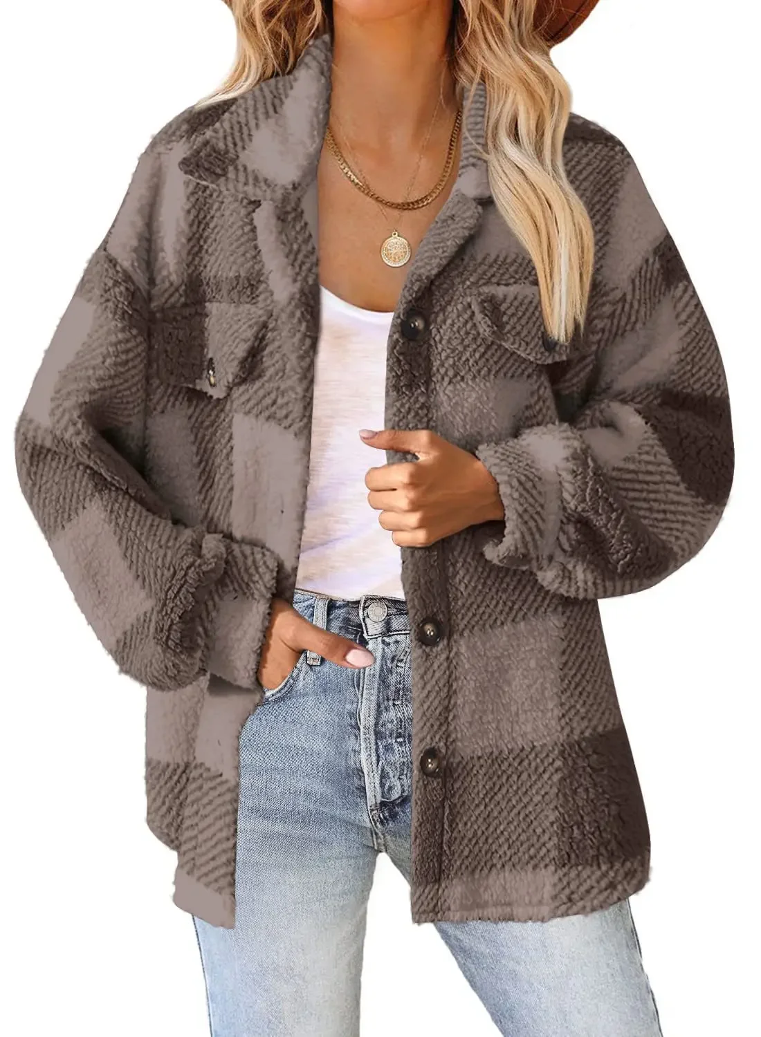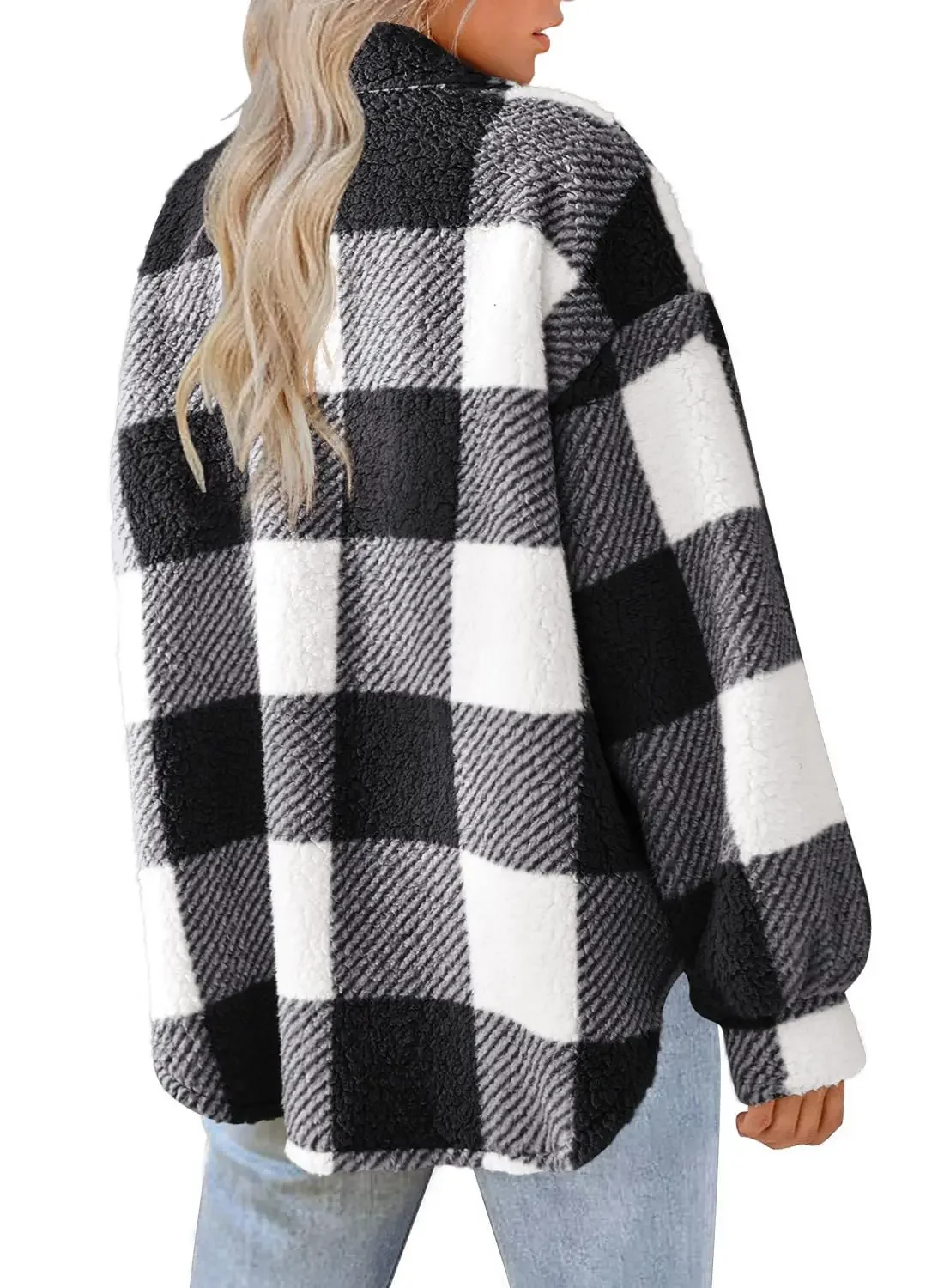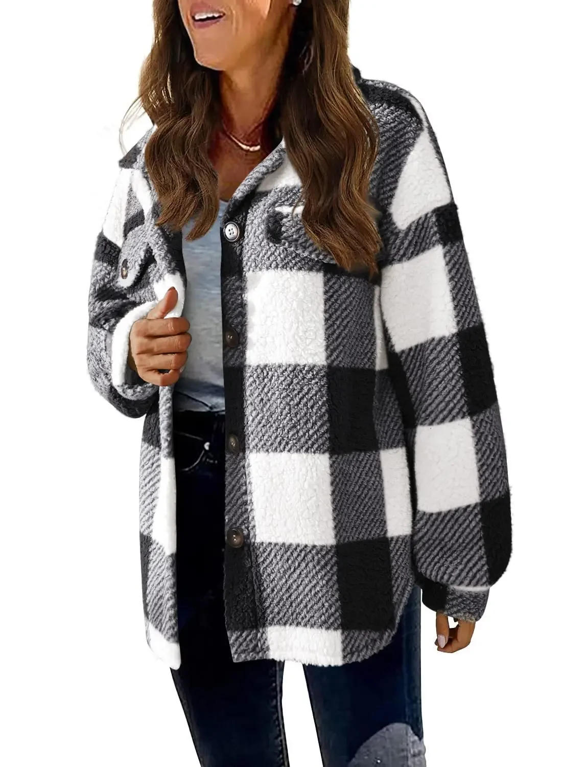 DERMEARNE Autumn Winter Women's Thickened Plaid Lamb Velvet Jacket with Pockets Buttoned Fluffy Outerwear Casual Loose Fit Coat