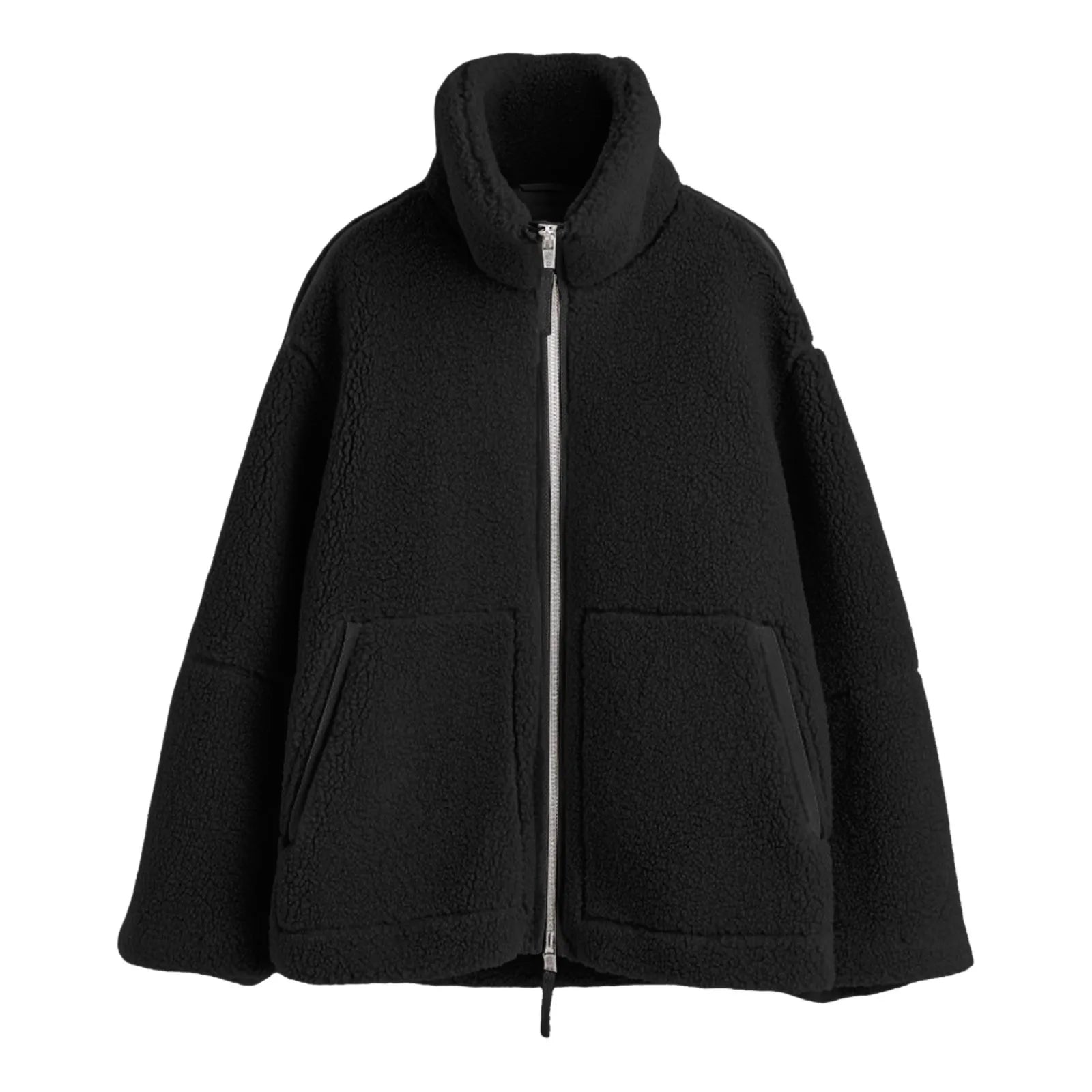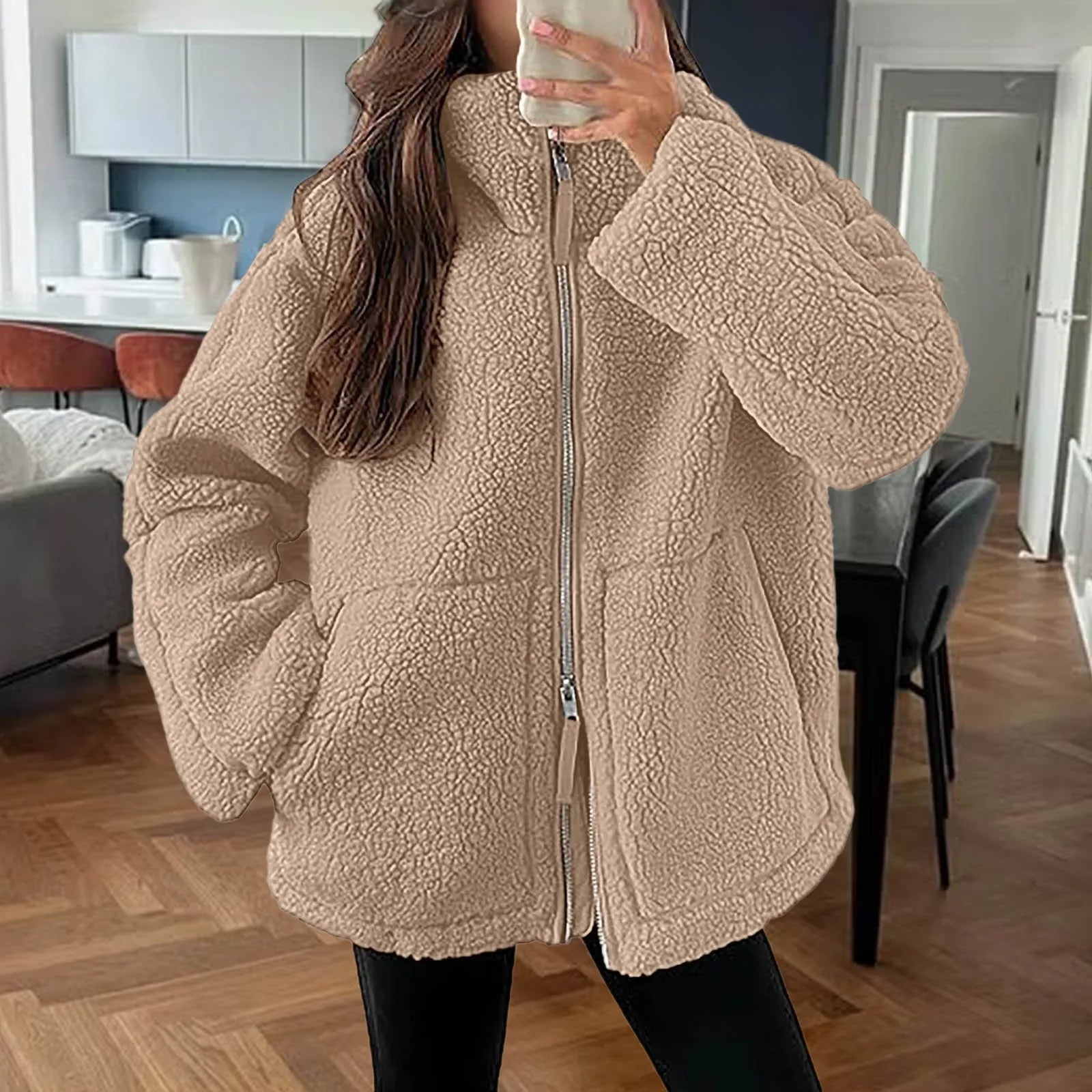 DERMEARNE Black Oversize Casual Double Zip Stand Collar Sweatshirts Autumn Winter Warm Wool Lamb Outwears Coat Fuzzy Fleece Jacket Pockets