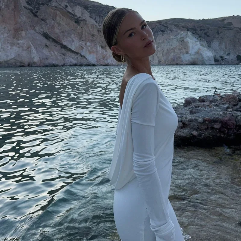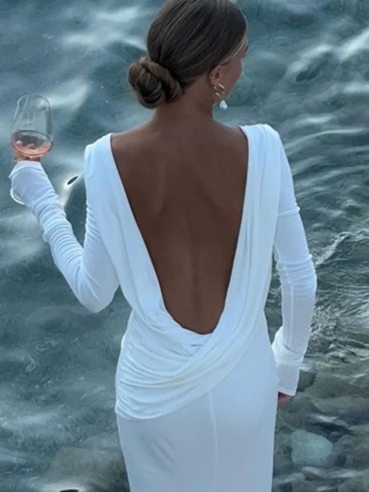 DERMEARNE Chic Backless White Long Sleeved Slim Fit Dress for Women Pleated Elegant Round Neck Long Dresses 2025 New Female Evening Gowns