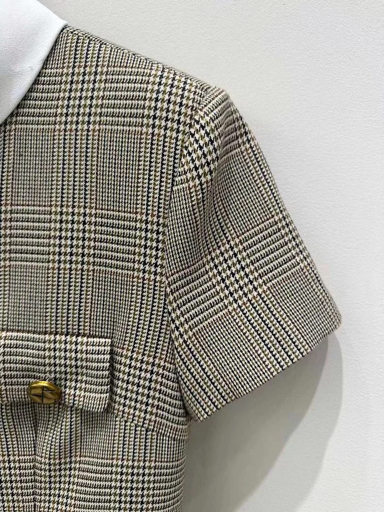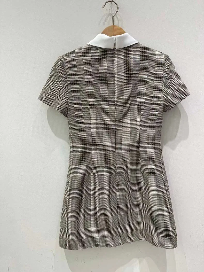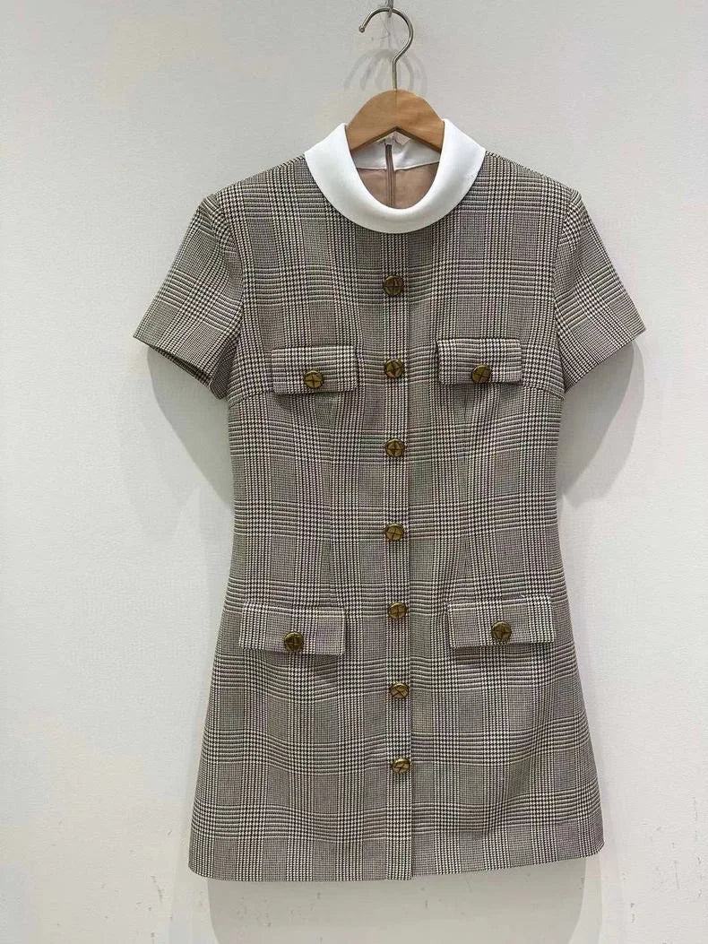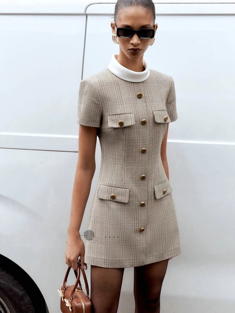 DERMEARNE Color collision high collar plaid dress temperament retro single-breasted short-sleeved women's dress 2025 spring new