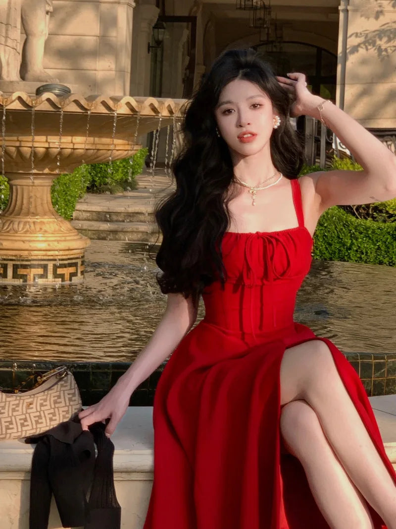 DERMEARNE French Elegant White Strap Midi Dress 2025 Summer New Casual Evening Party Dress Women Beach Sleeveless Lace-up Red Dress Korean