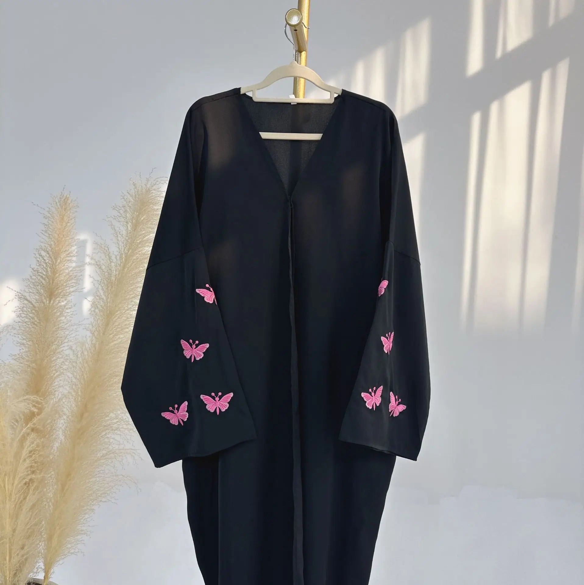 DERMEARNE Front Open Abaya Women Kimono Muslim Women's Dresses Butterfly Embroidery Eid Soft Satin Abaya Arab Dubai Islamic Clothing