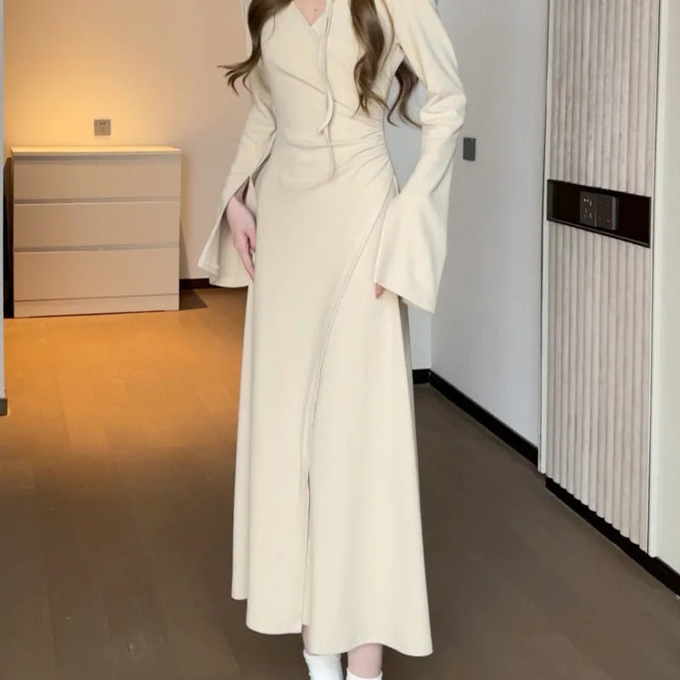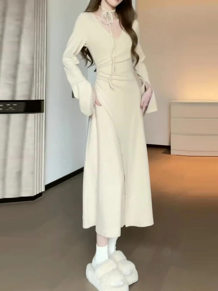 DERMEARNE Gentle and Sexy V-neck Knitted Dress Women's Autumn Winter New Style Temperament Slimming