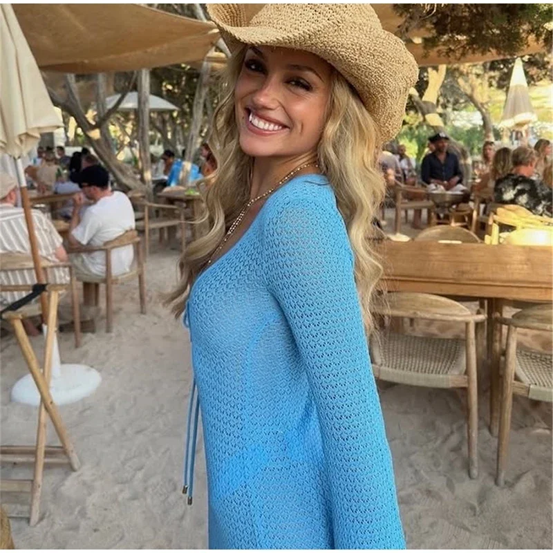 DERMEARNE Holiday Hollow Out Mini Dress Women Knit Lace up Long Flare Sleeve Beach Dresses 2025 Fashion Lady Vacation Solid Vestidos