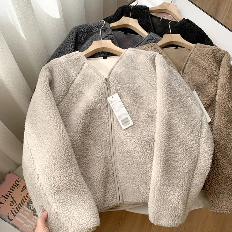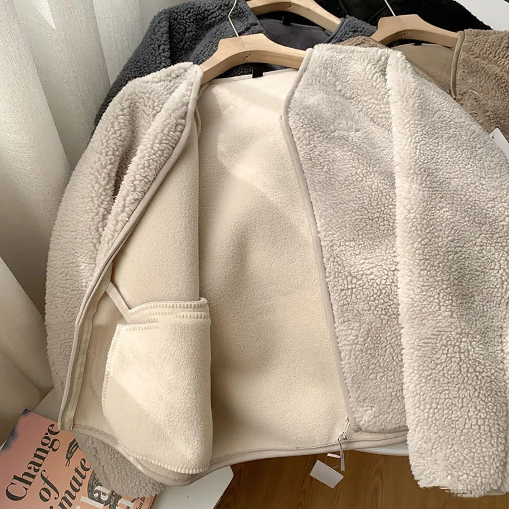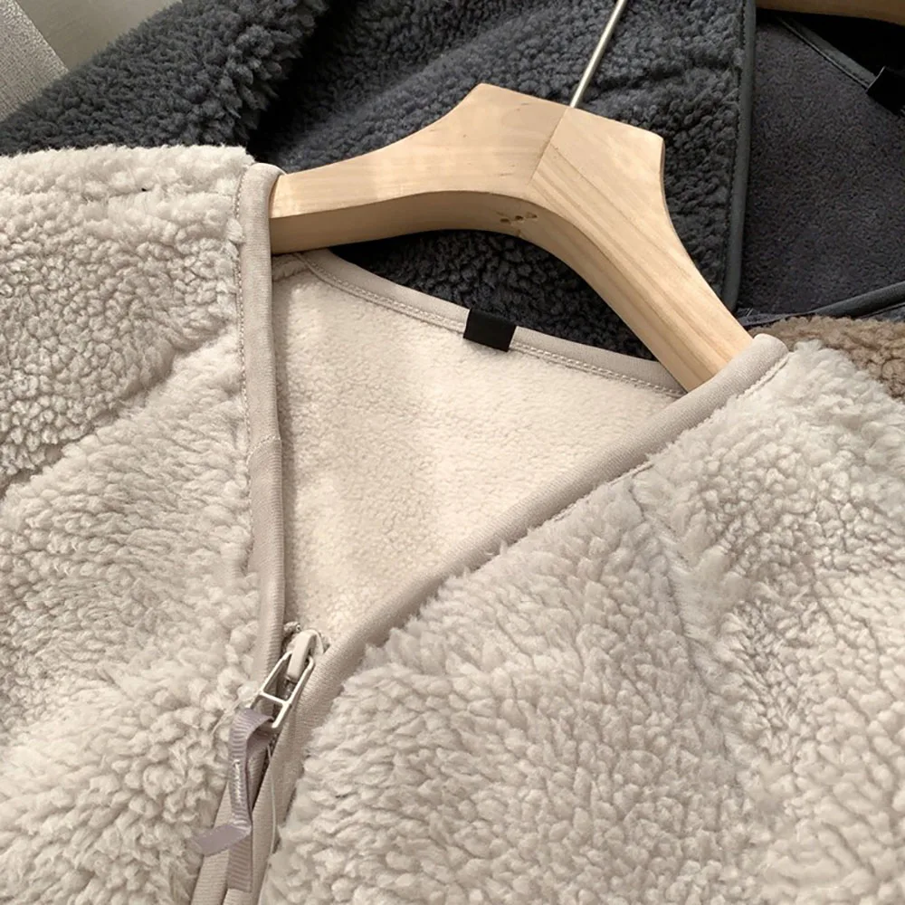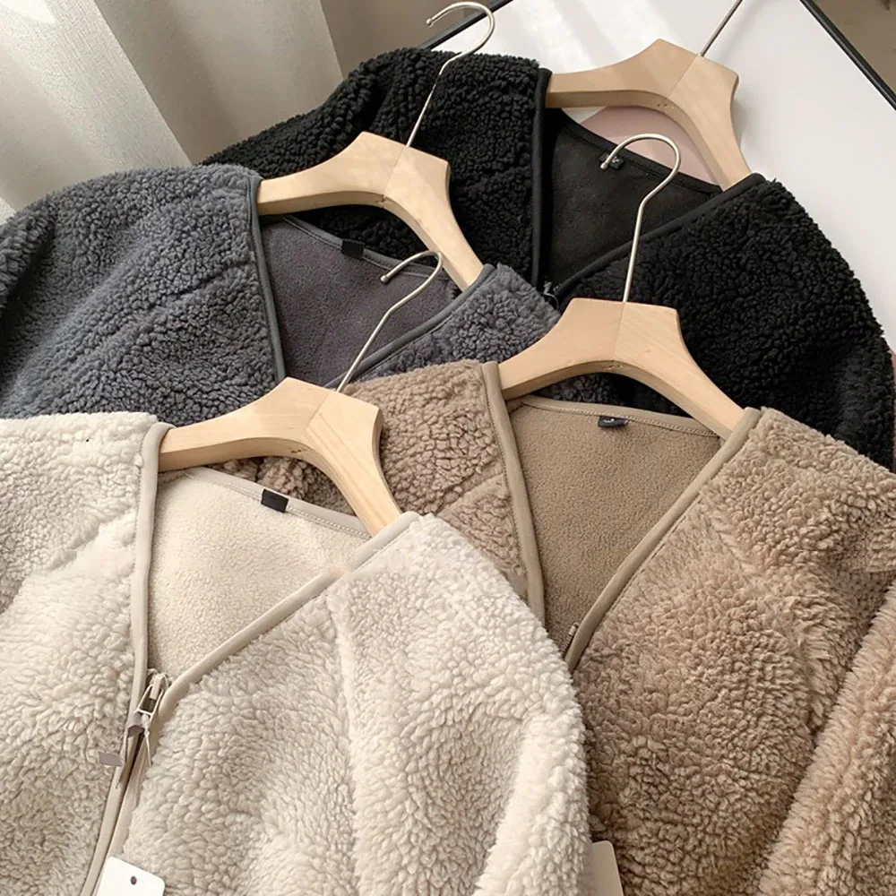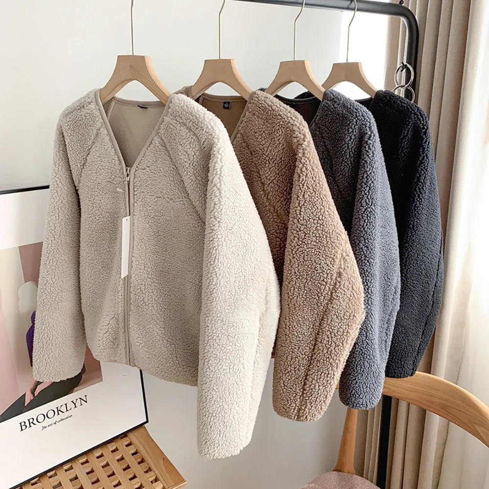 DERMEARNE Korean Version Autumn Winter Women's New Coat Soft Lamb Wool V-Neck Zipper Thicken Warm Fleece Jacket Solid Texture Short Coat