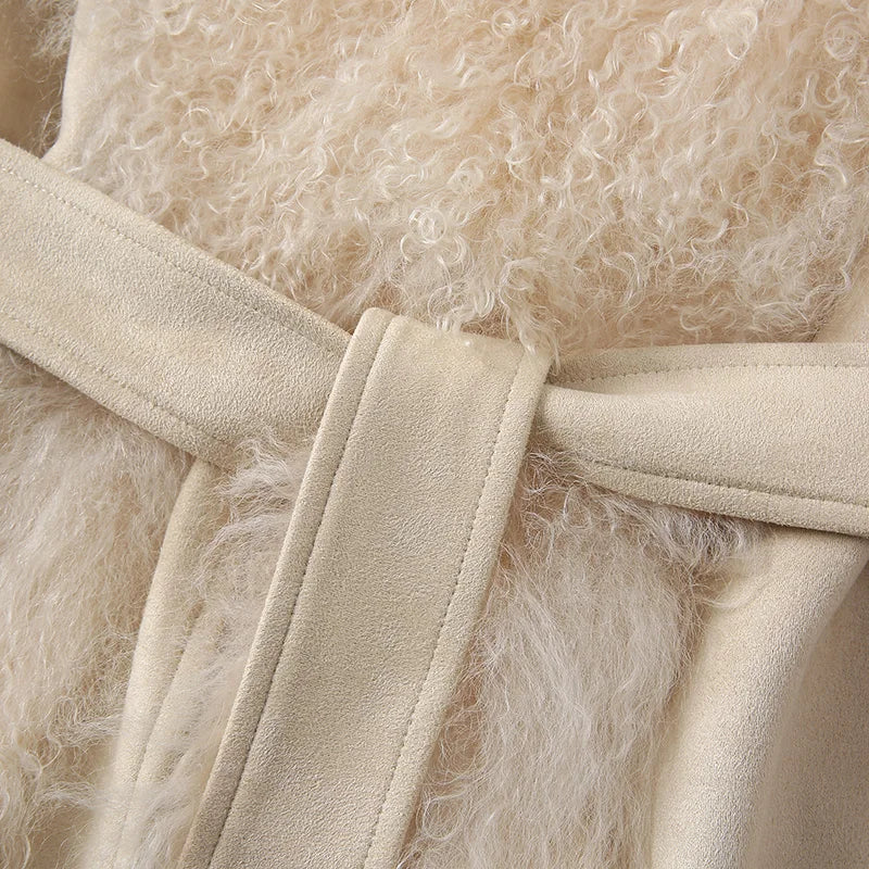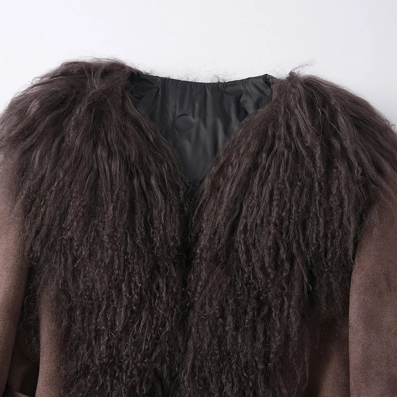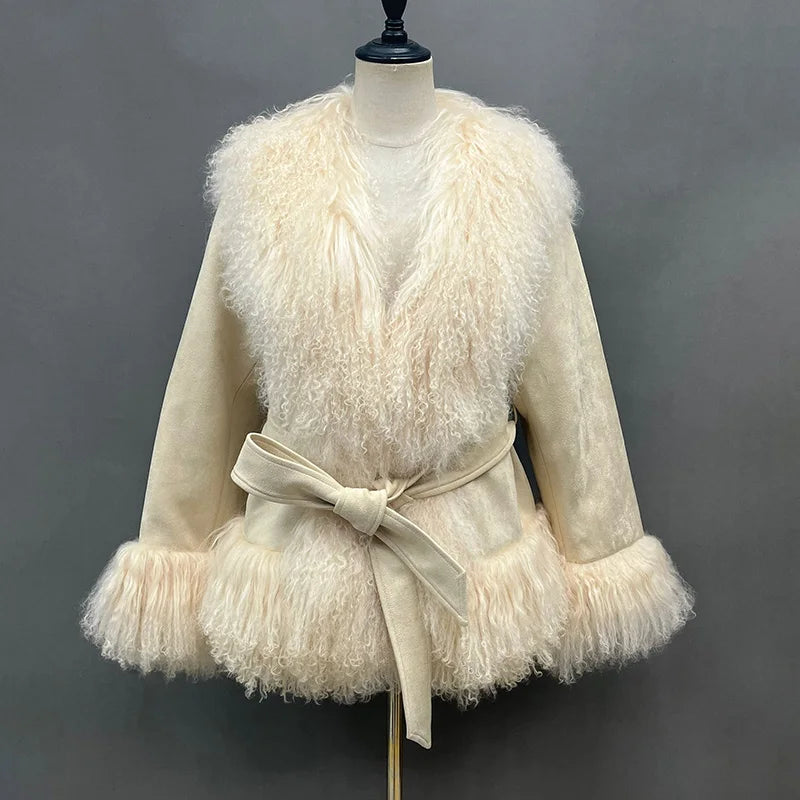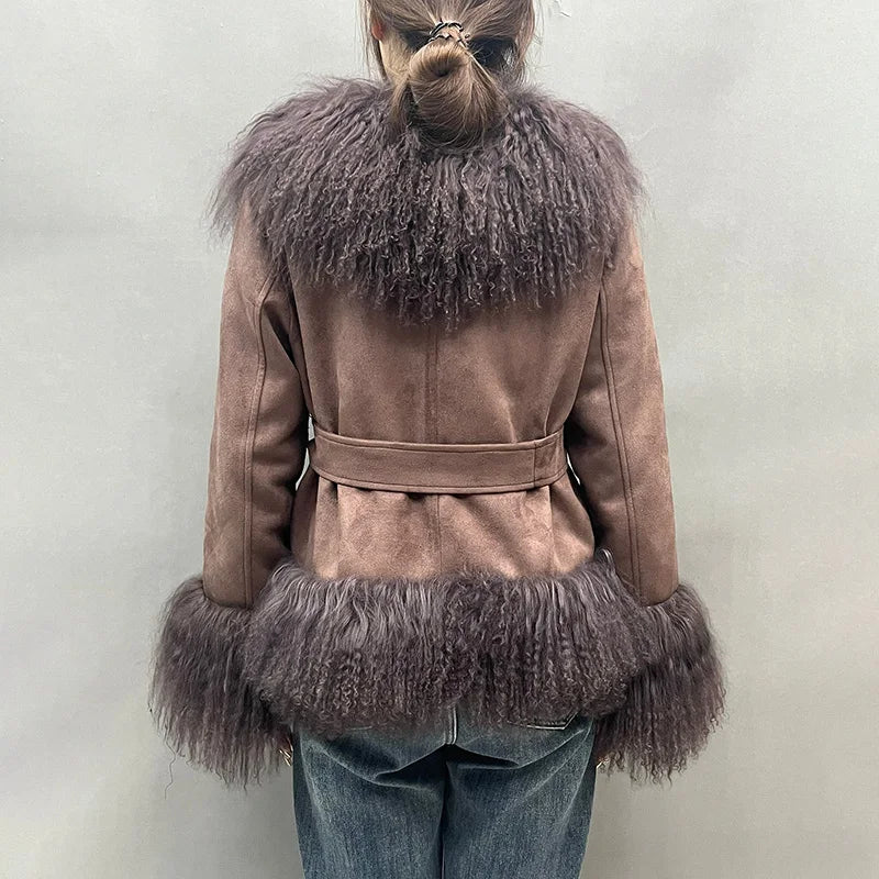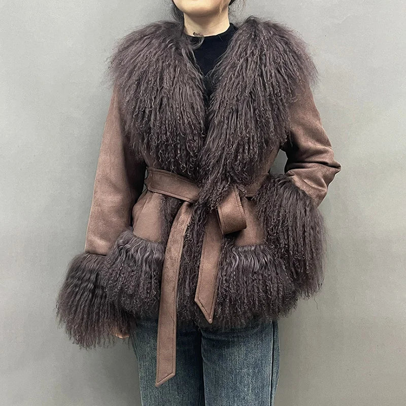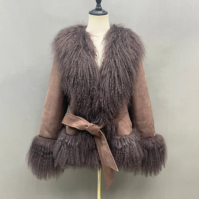 DERMEARNE Lady Luxury Winter Thick Warm Mongolian Sheep Fur Collar Cuffs Natural Fur Coats Women Stand Collar Crop Jacket LZ6513