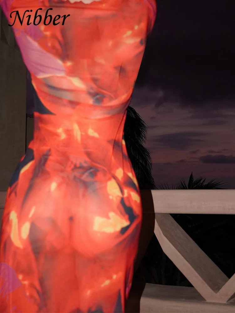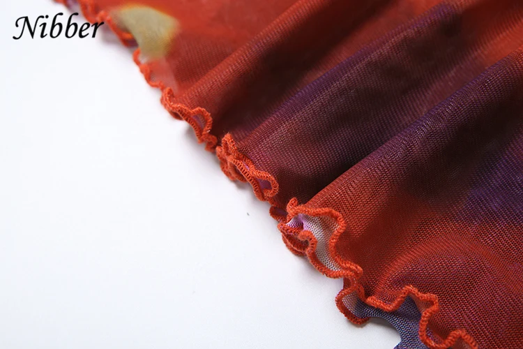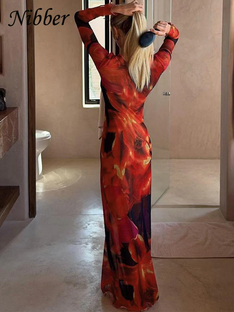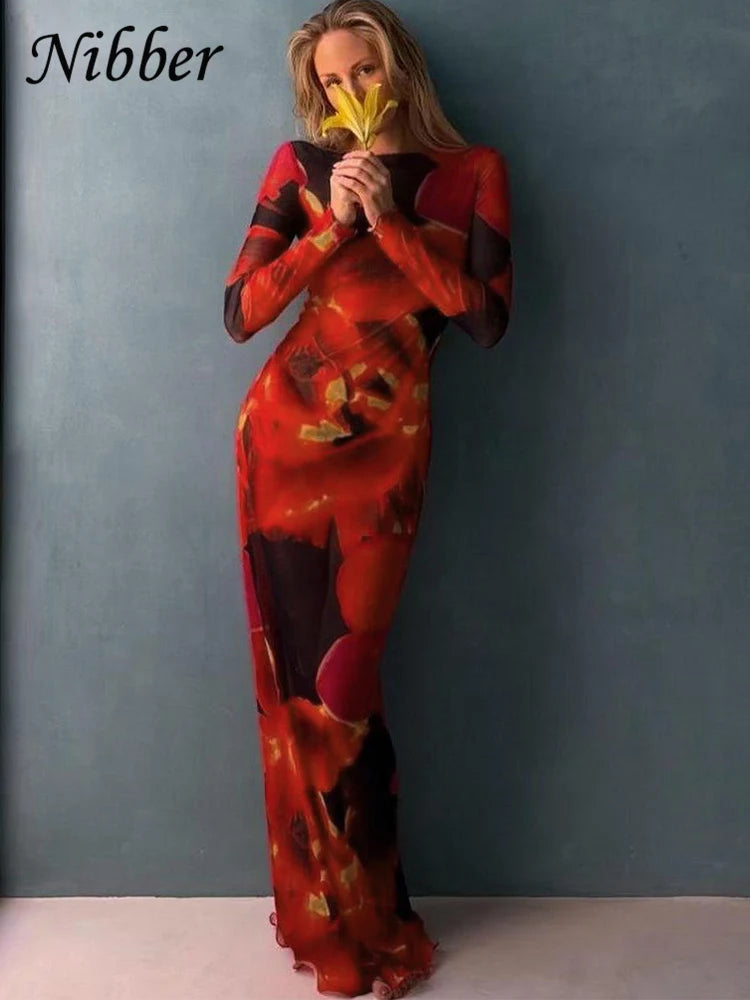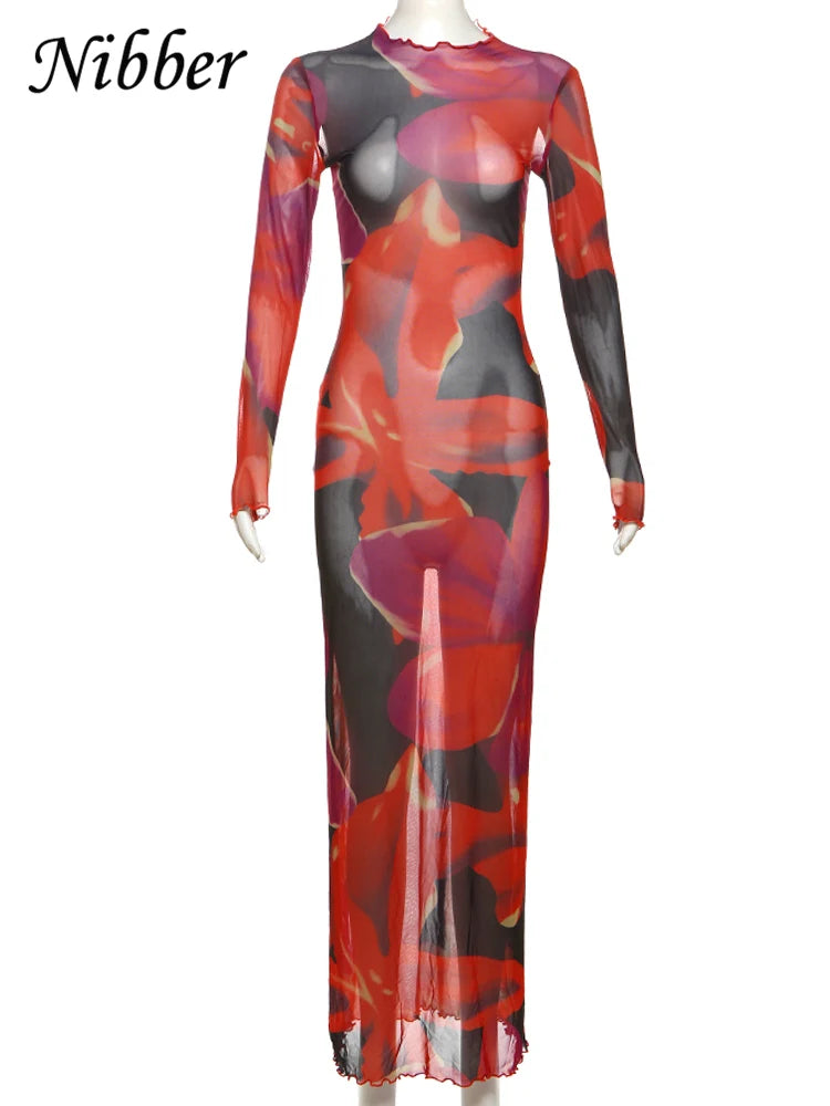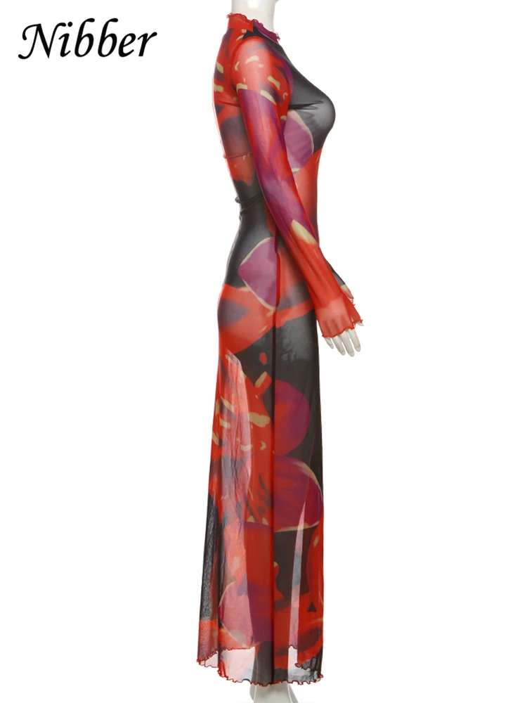 DERMEARNE Nibber Colorful Print Dress Women Velvet See Through Skinny Full Sleeve Lace Hem Autumn Trend Stretch Casual Basic Long Bodycon
