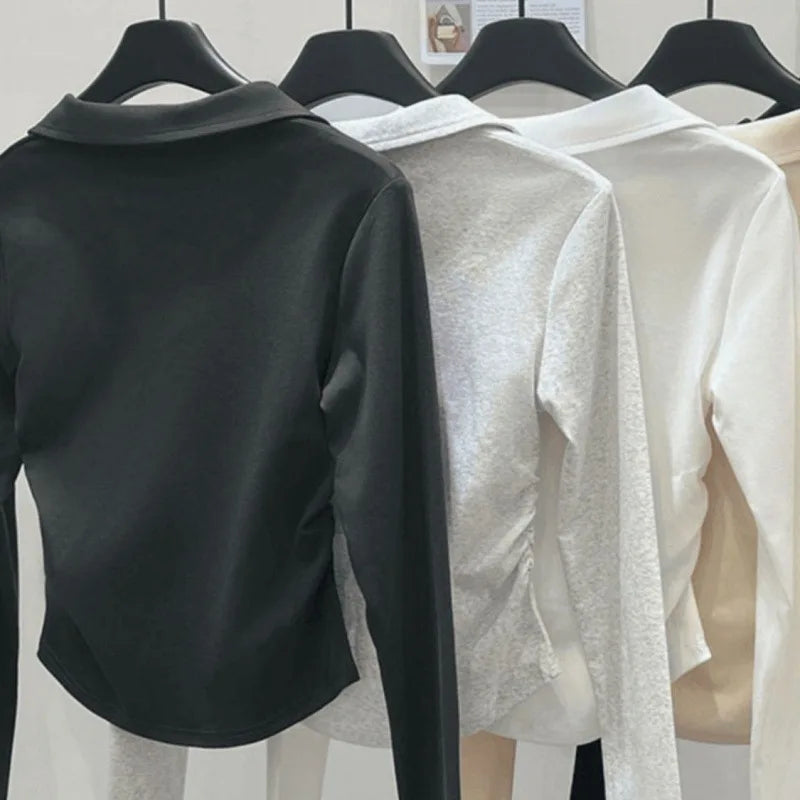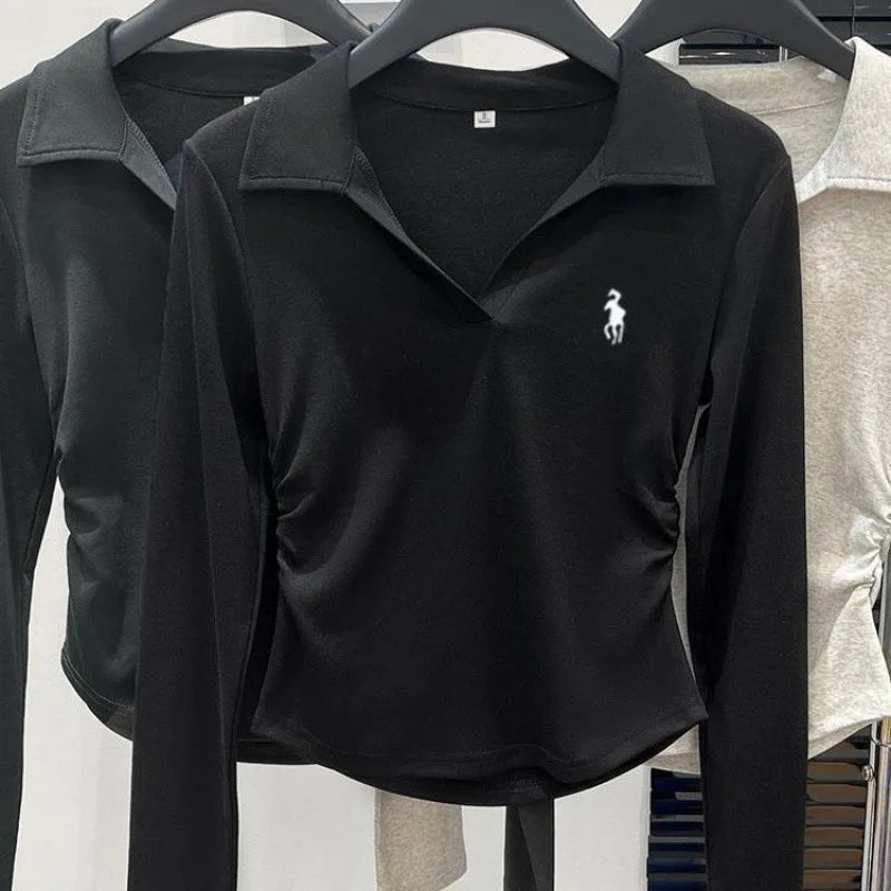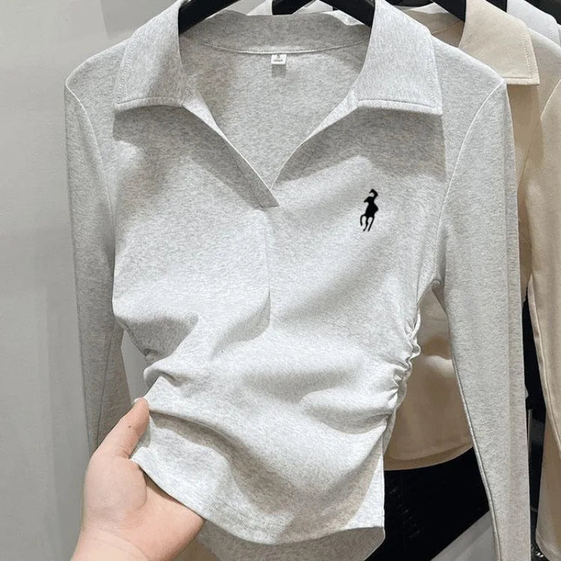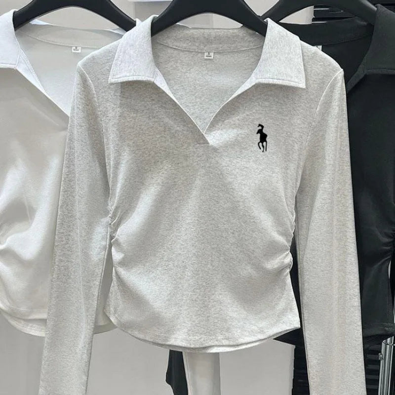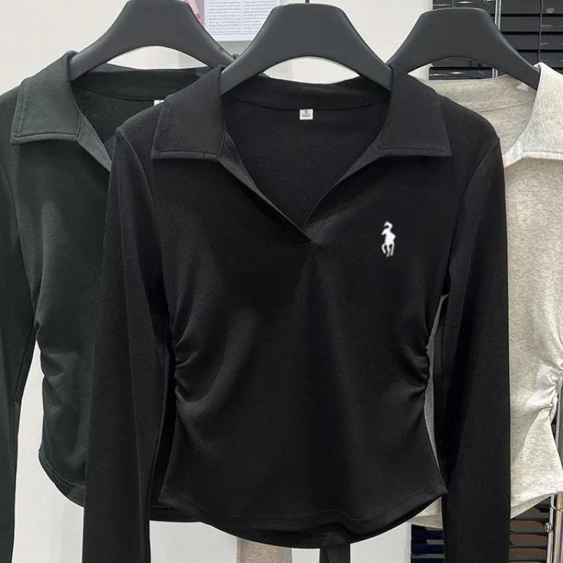 DERMEARNE Polo embroidered long sleeved base shirt for women, 2025 autumn and winter new slim fit and slimming top