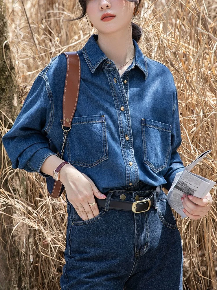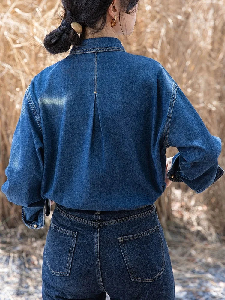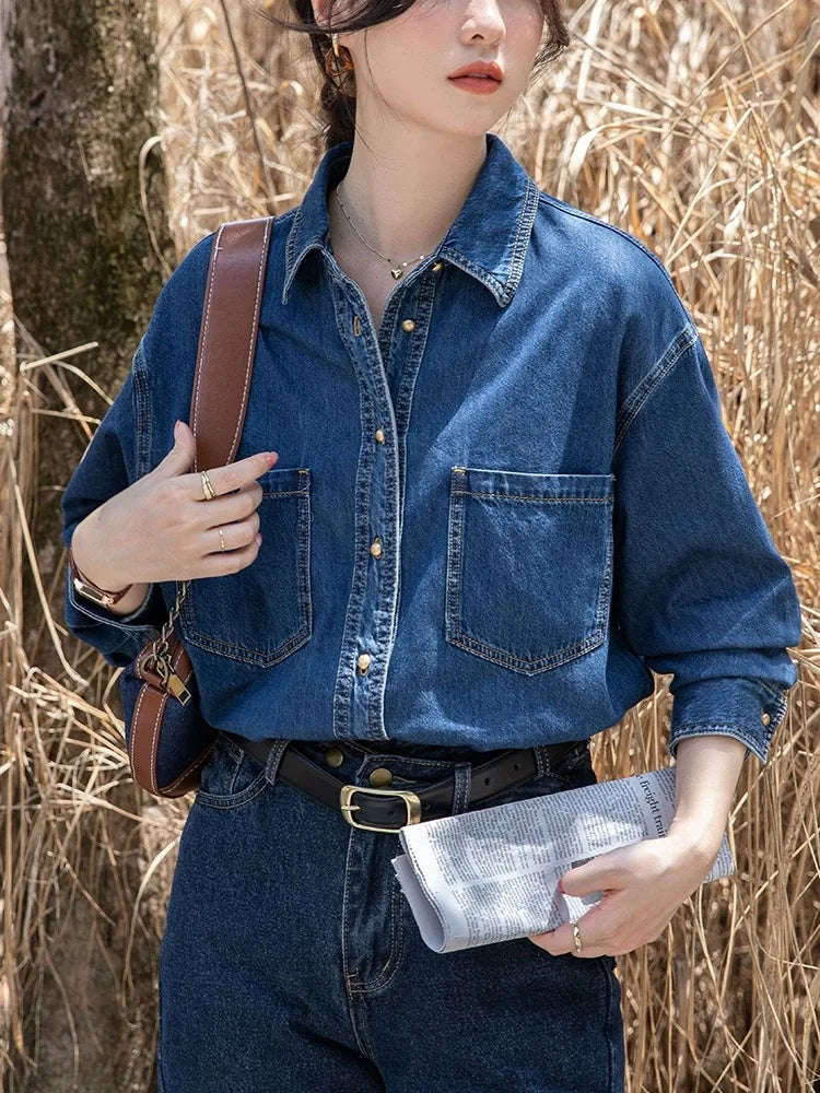 DERMEARNE Retro Dark Blue Denim Shirt Lapel Long Sleeved Soft Jean Shirt Spring Autumn Solid Color Casual Ladies Basic Blouse Tops