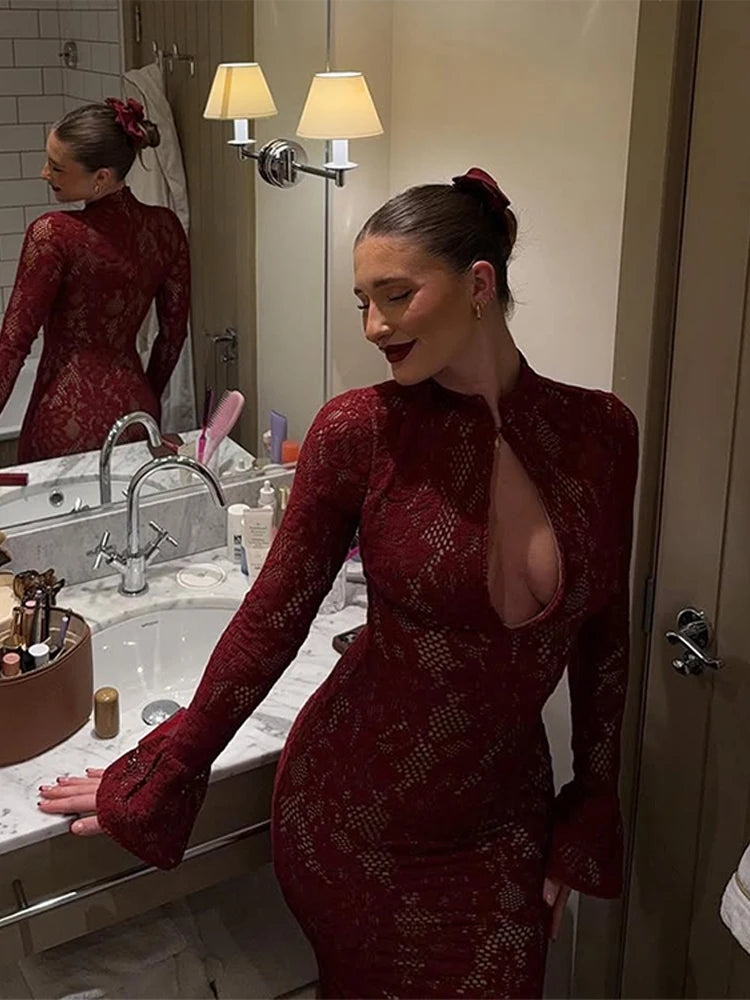 DERMEARNE Sexy Lace Hollow Out Women Dress Mandarin Collar Long Flare Sleeve Female Party Dresses 2025 Spring New Slim Evening Robe Lady