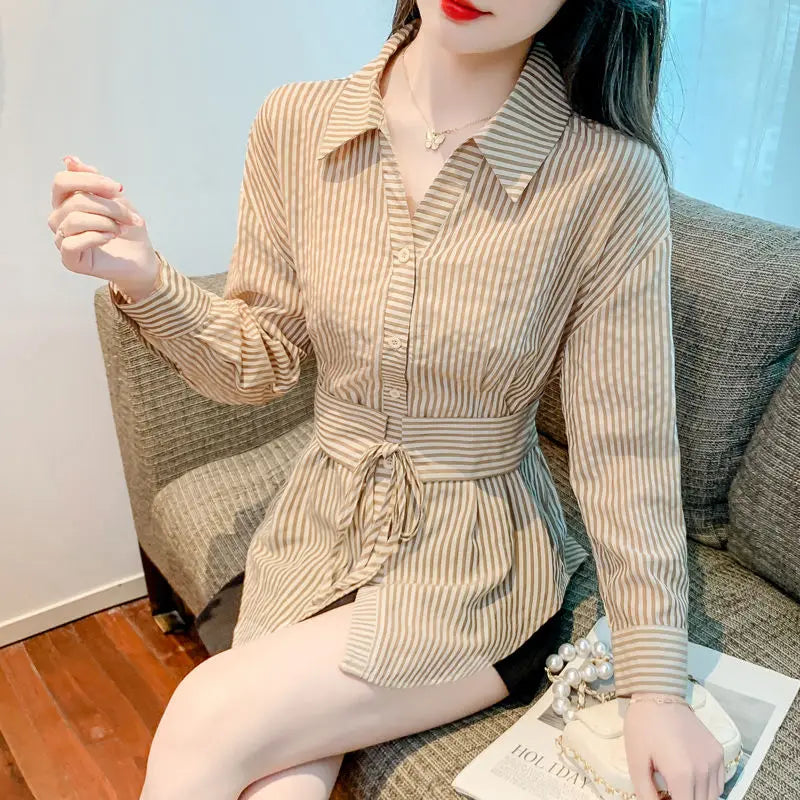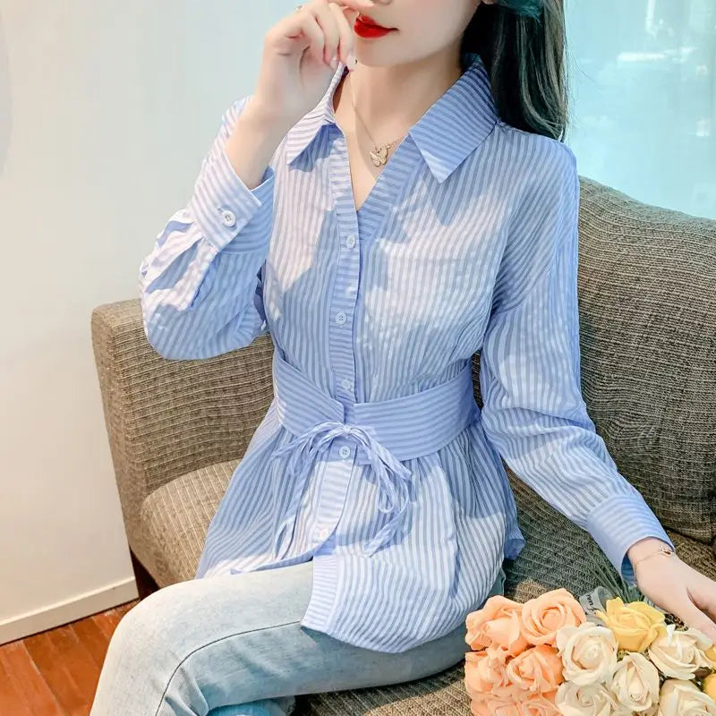 DERMEARNE Spring Autumn New Fashion Striped Shirts Women's Clothing POLO Collar Long Sleeve Dovetail Slim Korean Lacing Simplicity Tops
