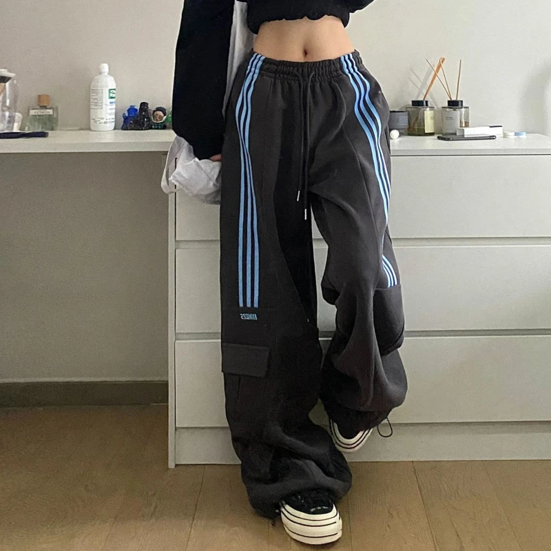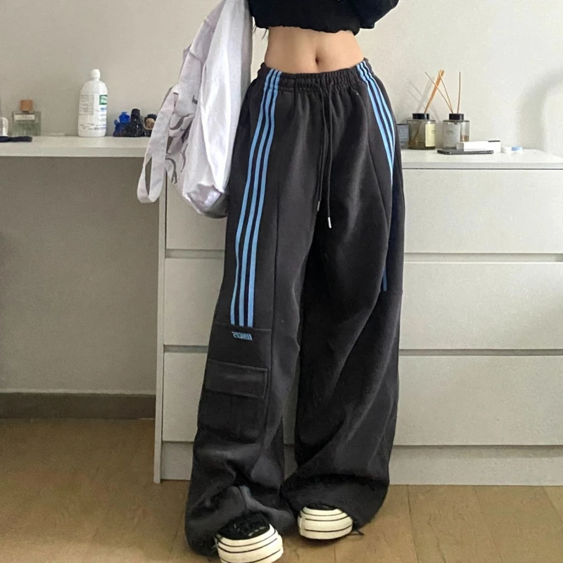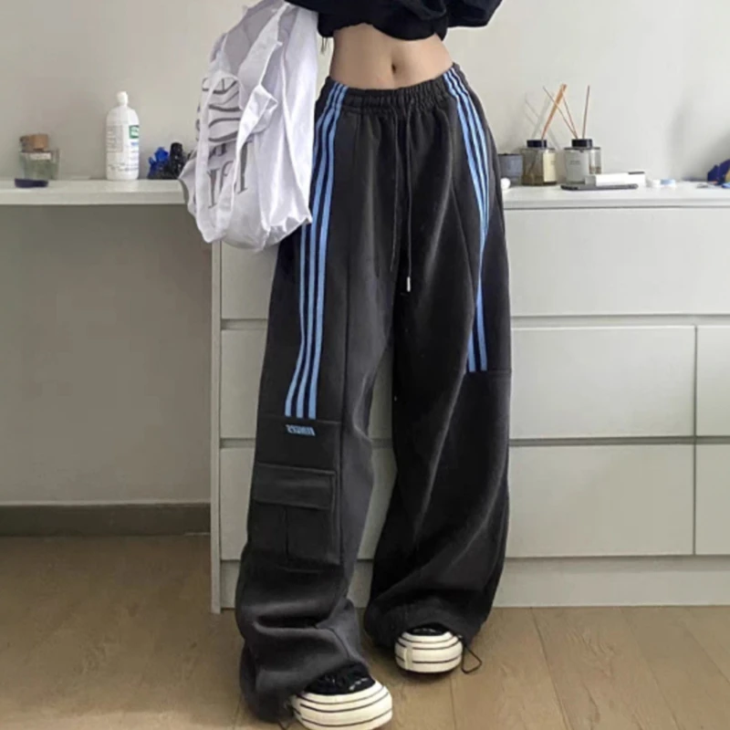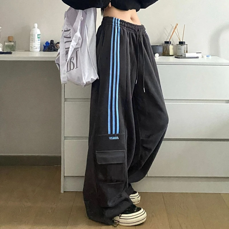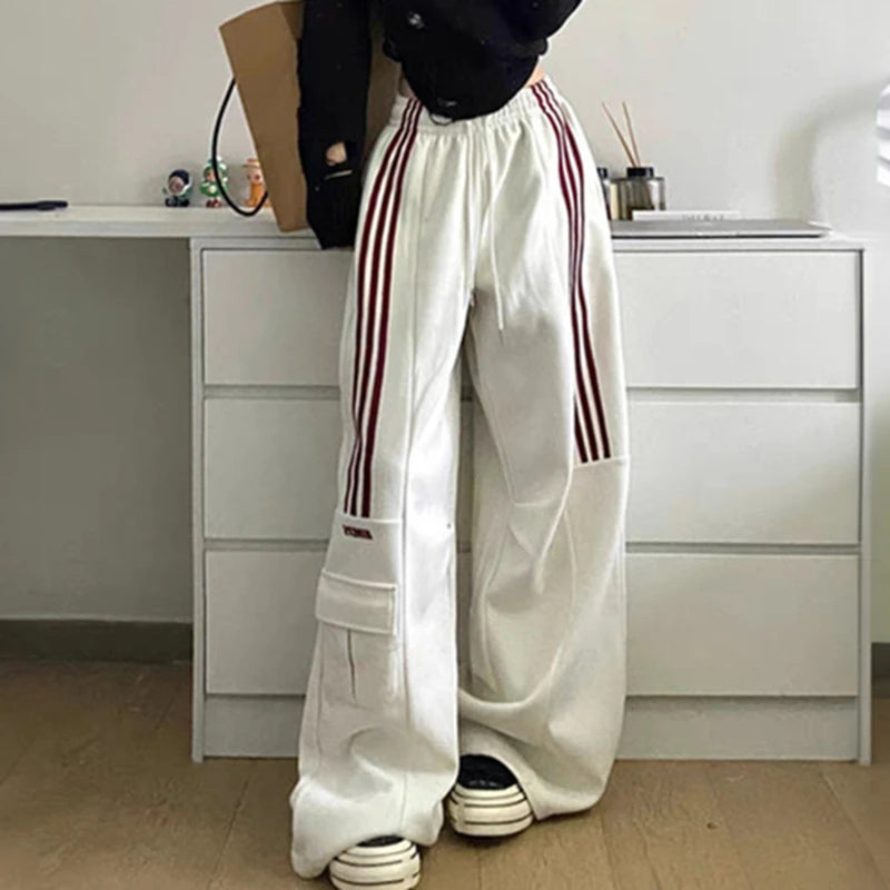 DERMEARNE Striped Sweatpants Women Streetwear Cargo Pants Harajuku Wide Leg Joggers High Waist Baggy Sports Trousers