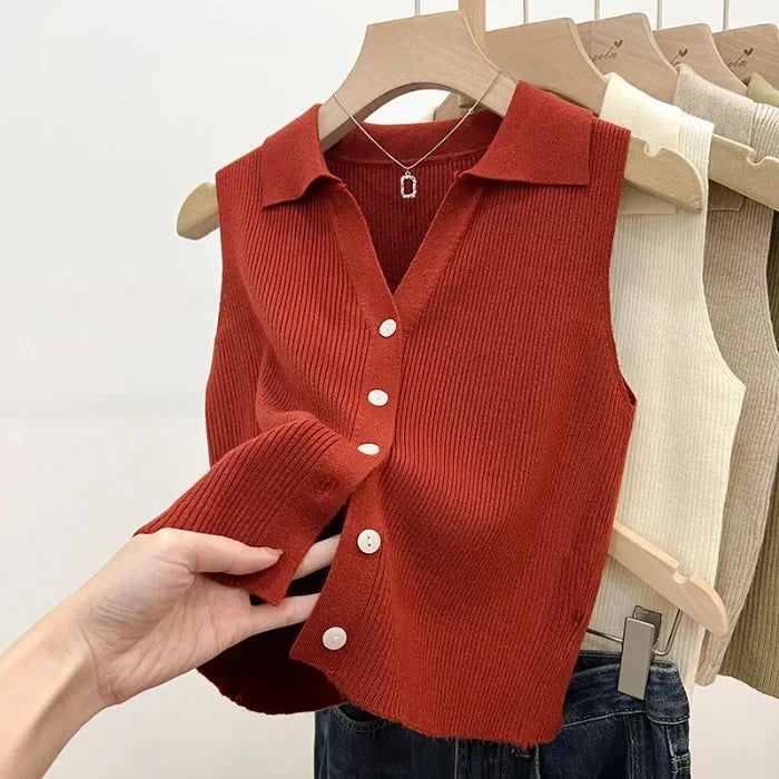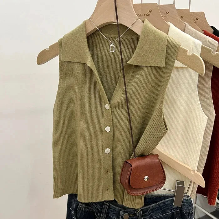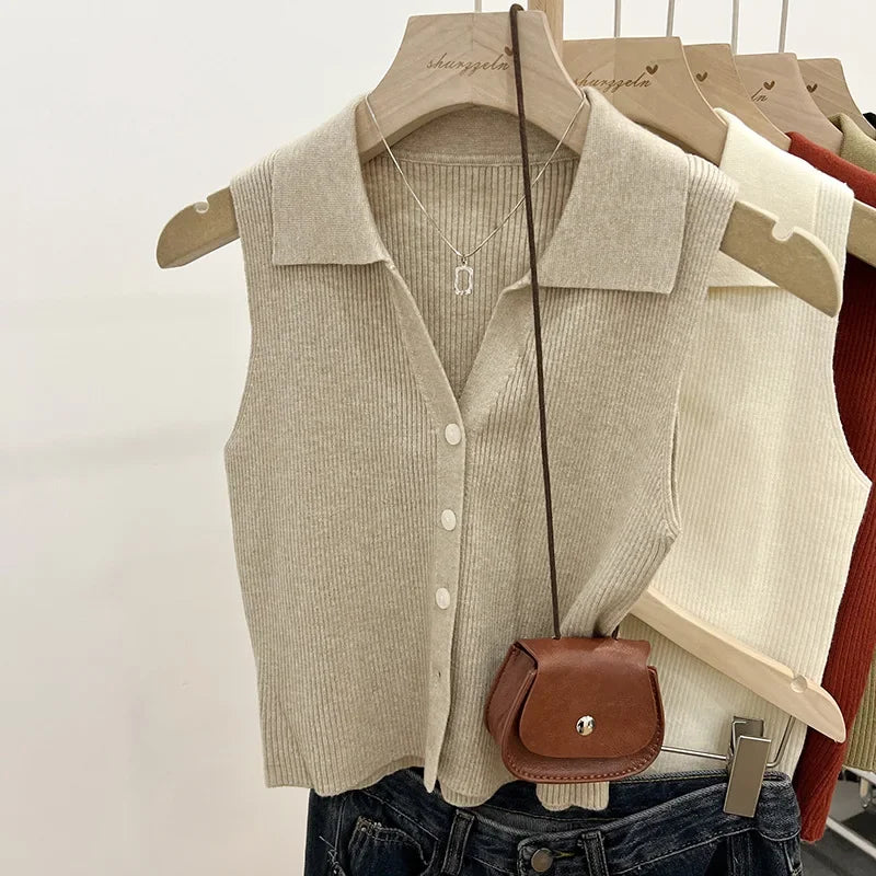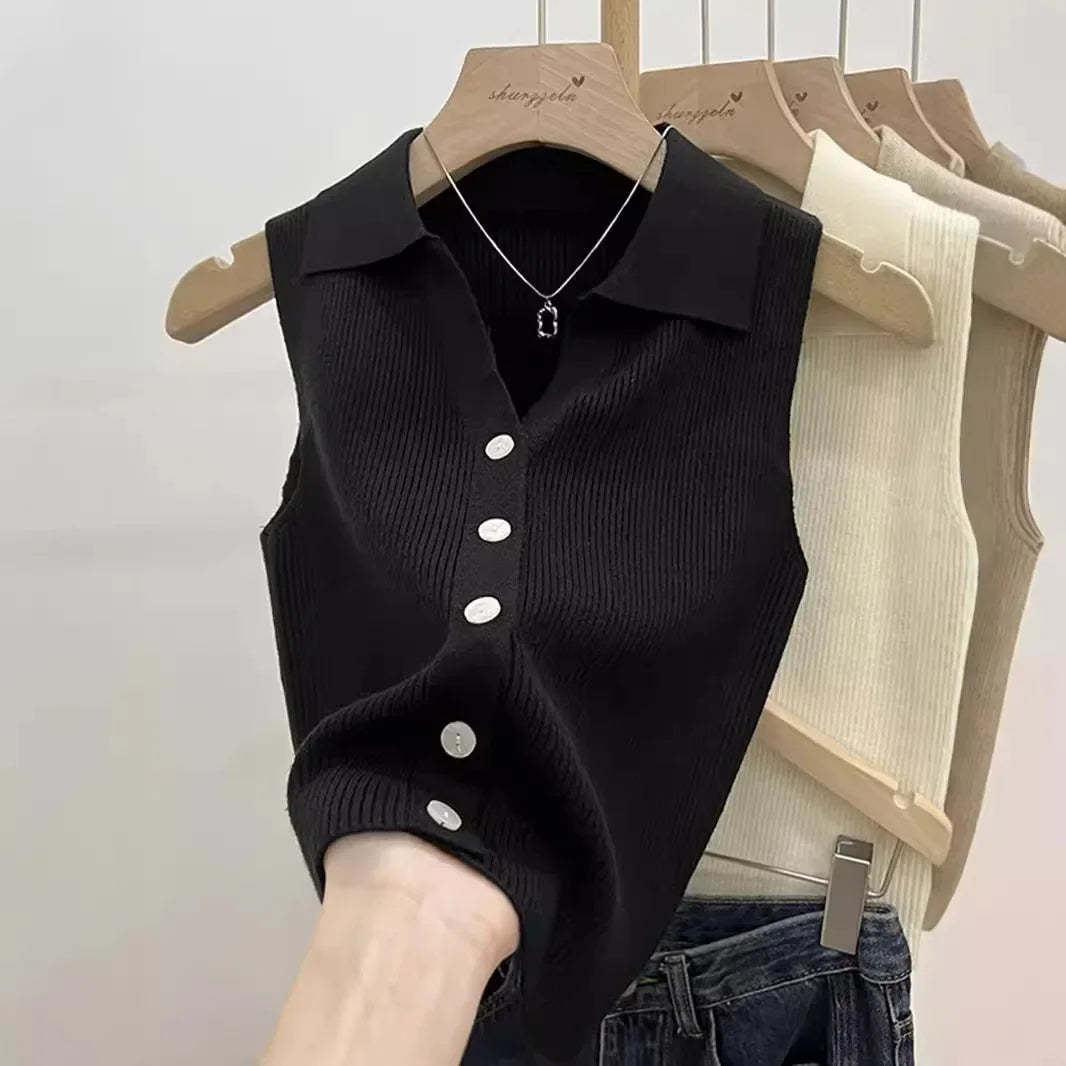 DERMEARNE Summer Chic Ice Silk Knitpolo Lapel Thin Slims You And Smooths Your Silhouette Tank Outer Wear Vest Women's Shoulder Vest No Sle
