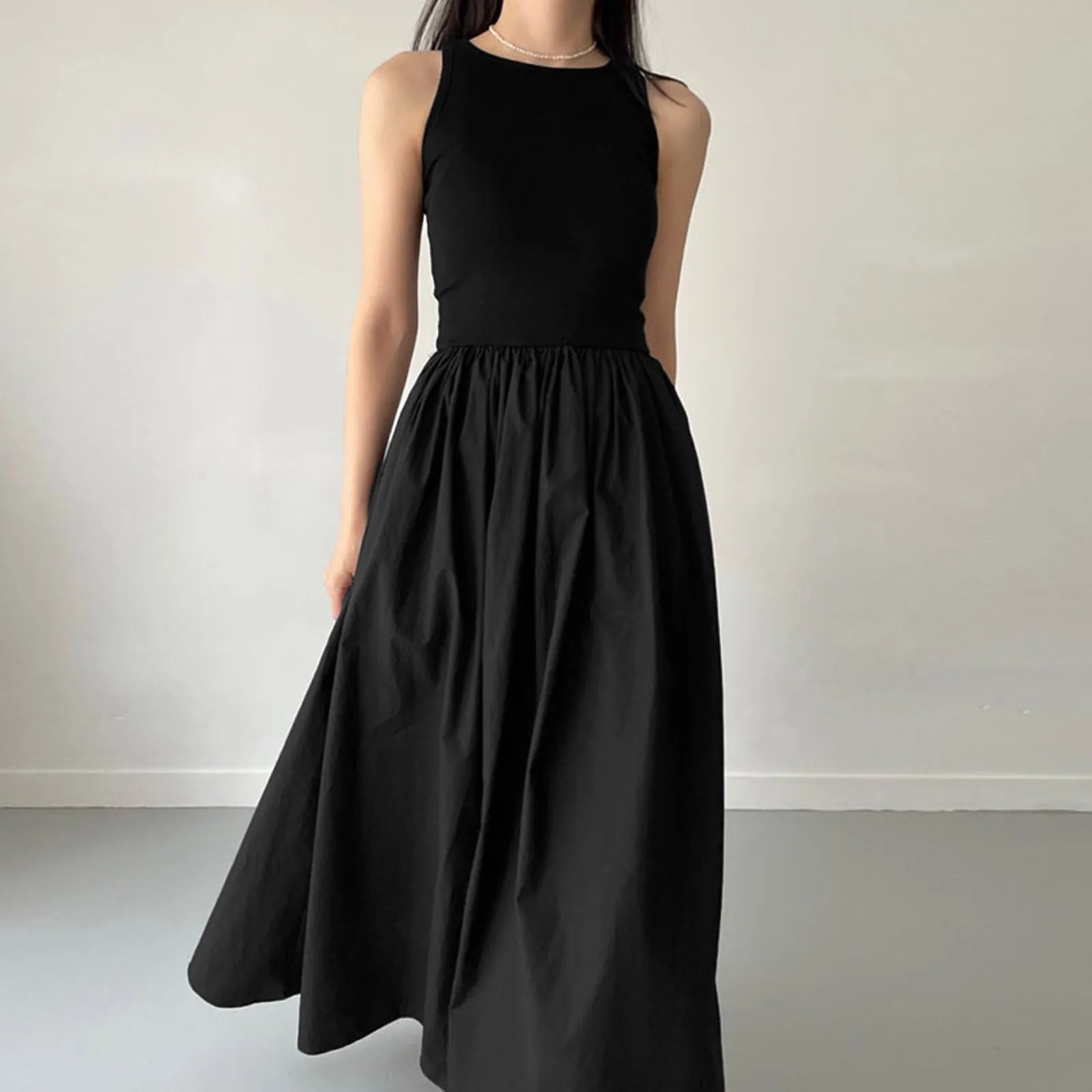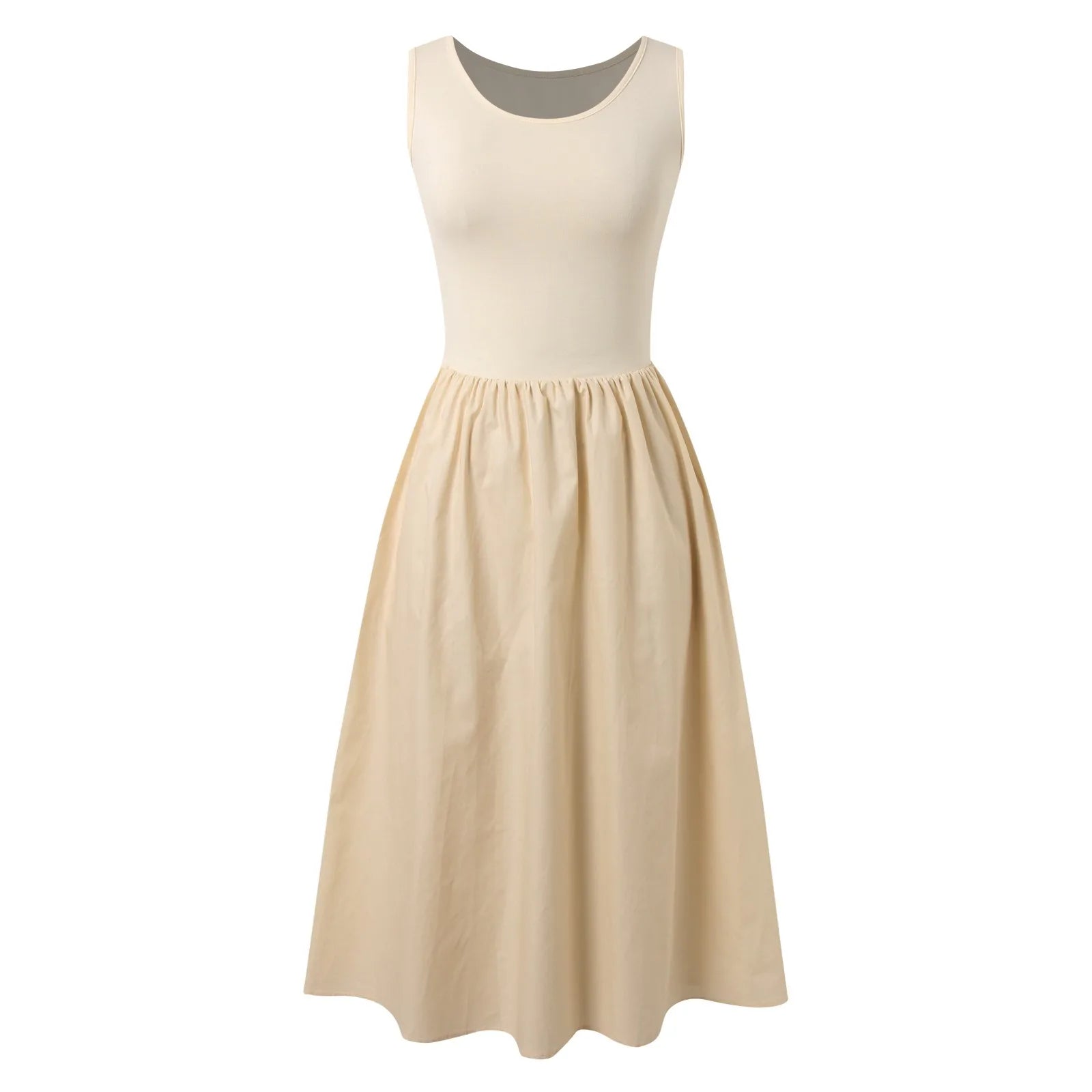 Summer Casual Sleeveless Maxi Dress for Women Patchwork Crewneck Flowy Tank Top Long Dresses with Pockets