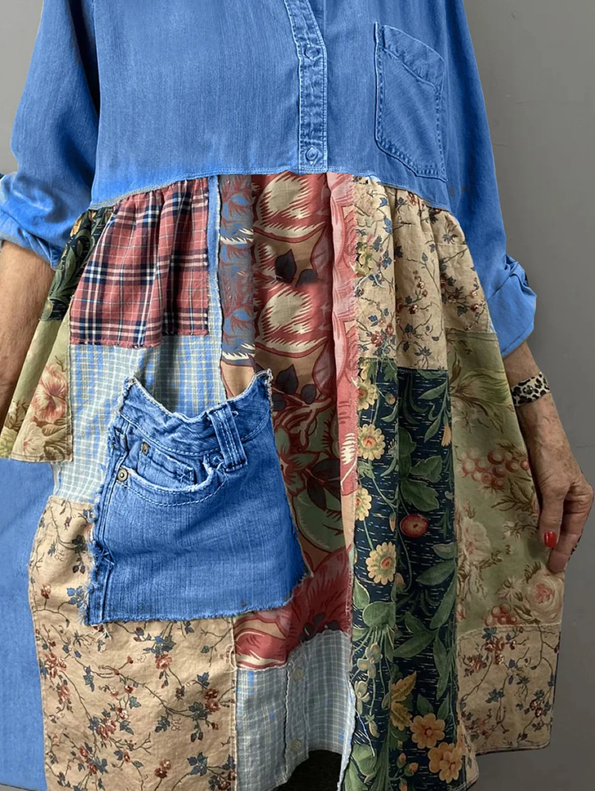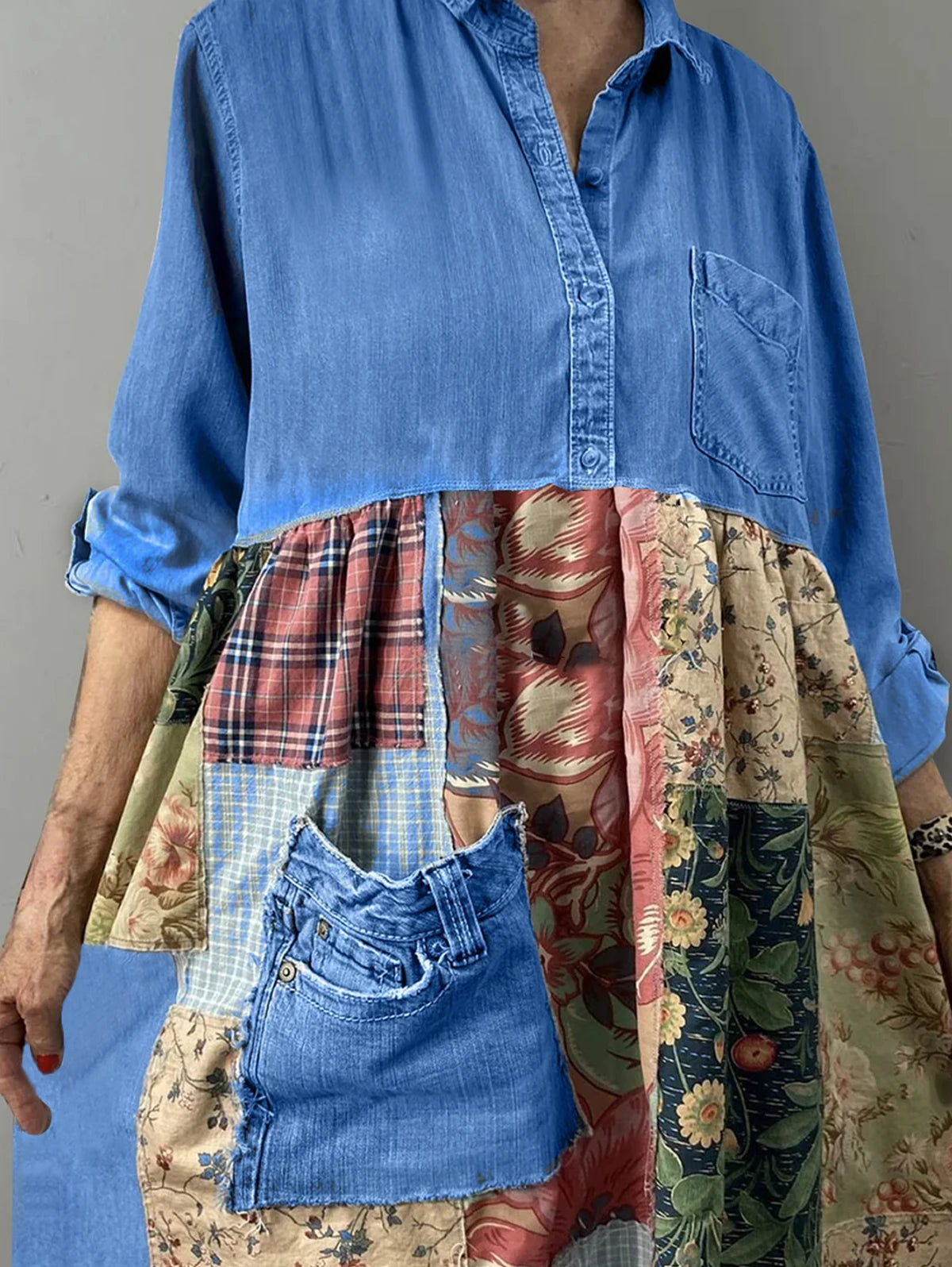 DERMEARNE Women Long Sleeve Boho Patchwork Turn-down Collar Single Breasted Denim Shirt Style Midi Dress Autumn Vestidos Casual Dresses