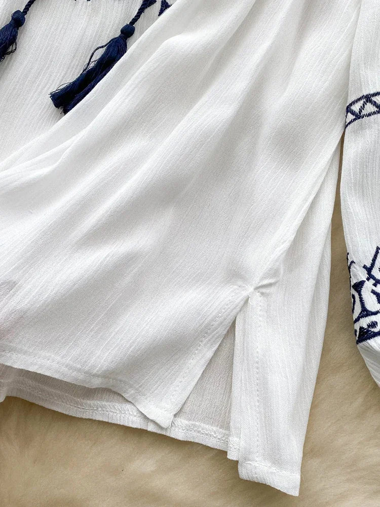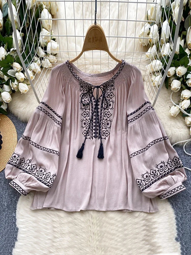 DERMEARNE Women's Bohemia Blouse Embroidered Autumn Spring O-neck Collar Bow Tie Lantern Sleeve Top Blusas Mujer Female Tops BL020