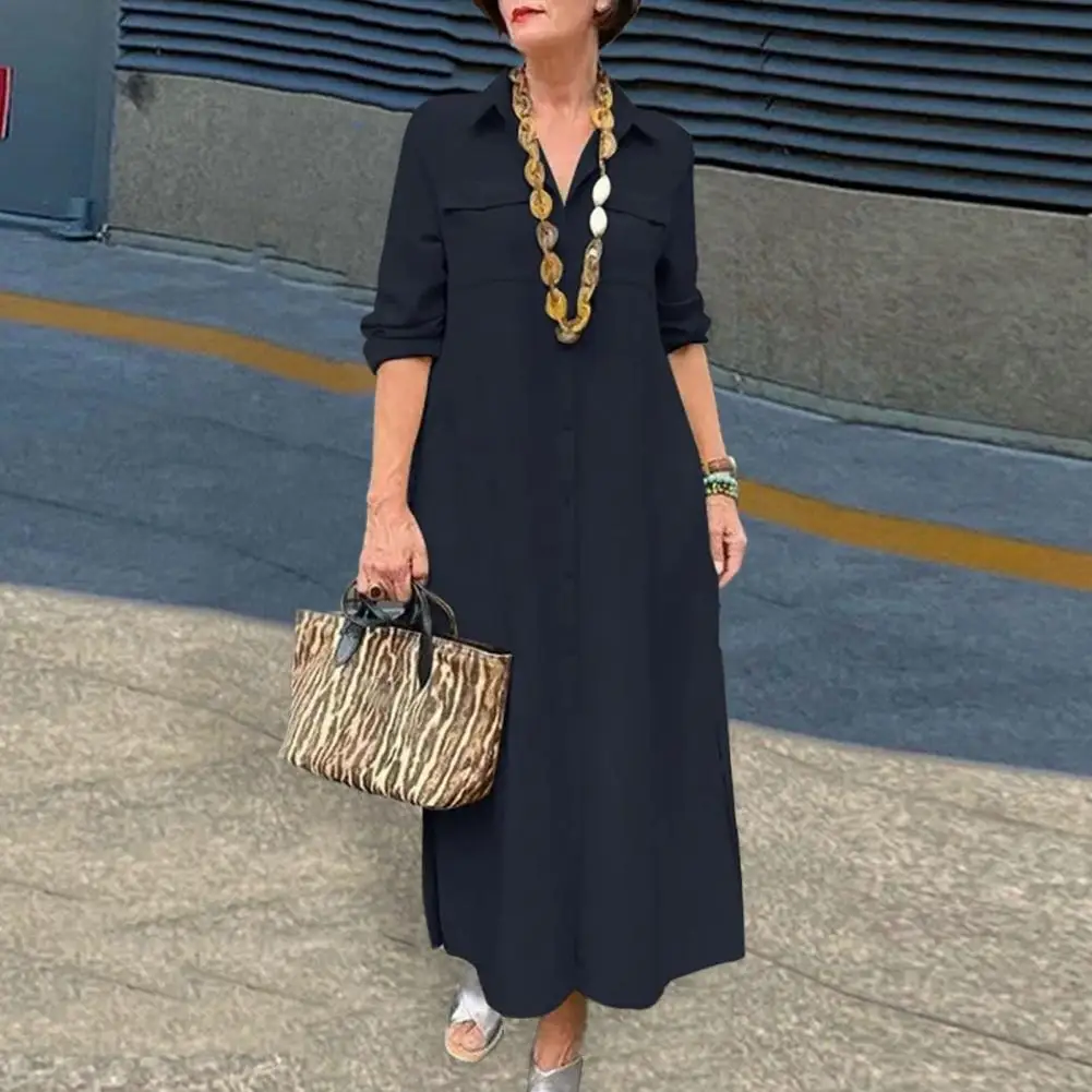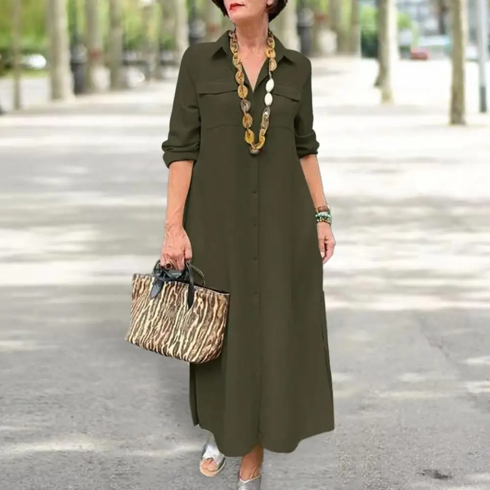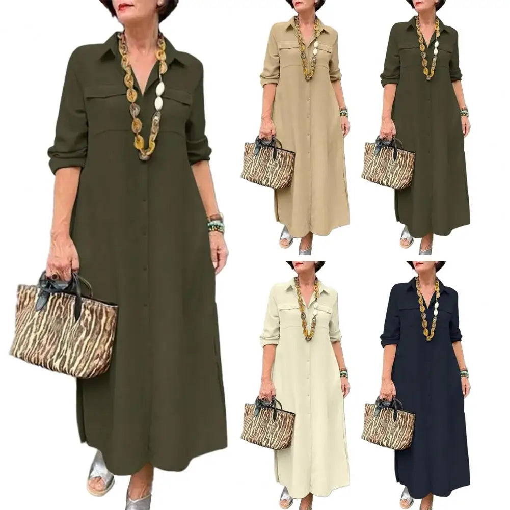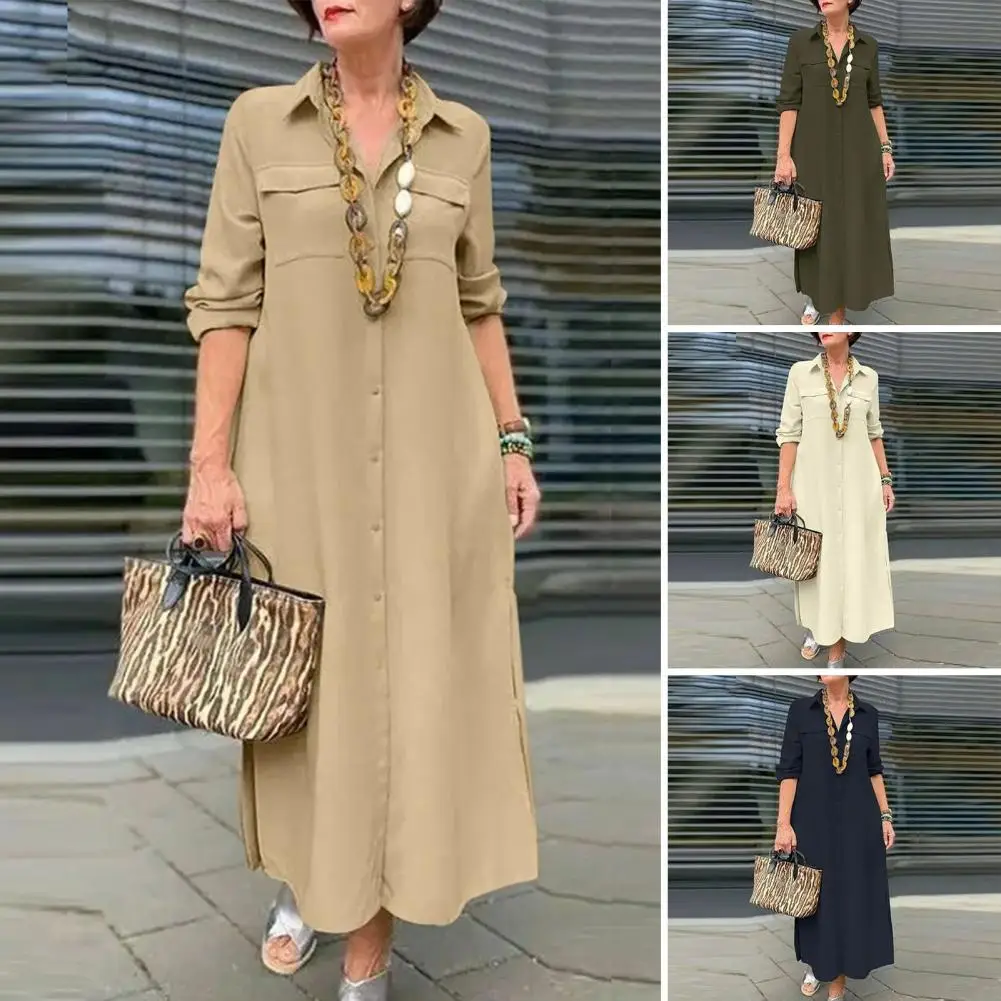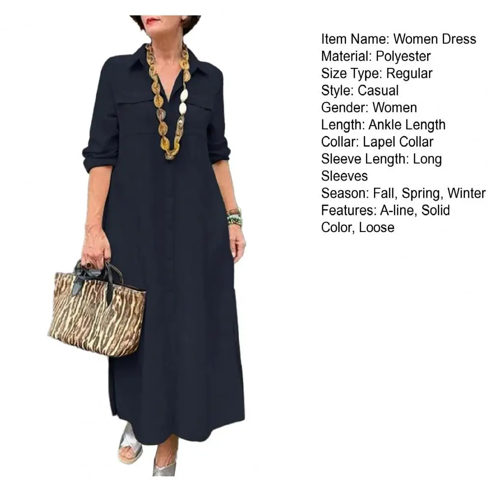 Women Dress Turn-down Collar Loose Solid Color Long Sleeve Single-breasted A-line Chest Pocket Soft Breathable Ankle Length Spring Fall Maxi Dress