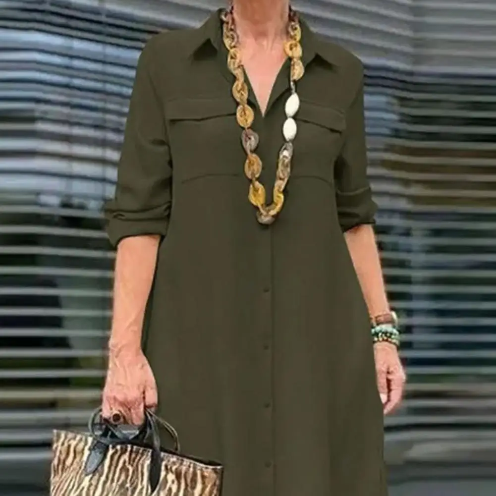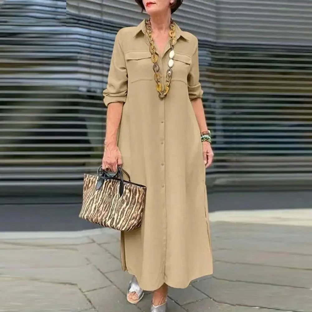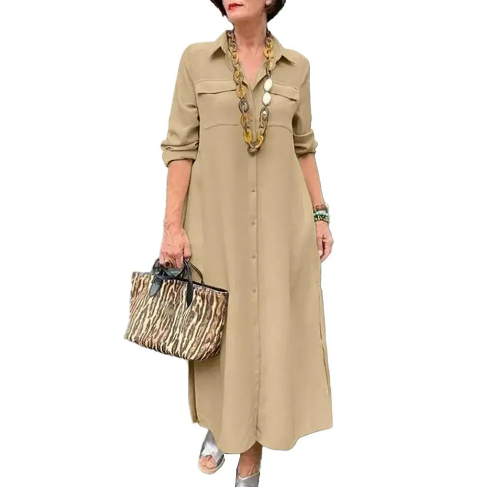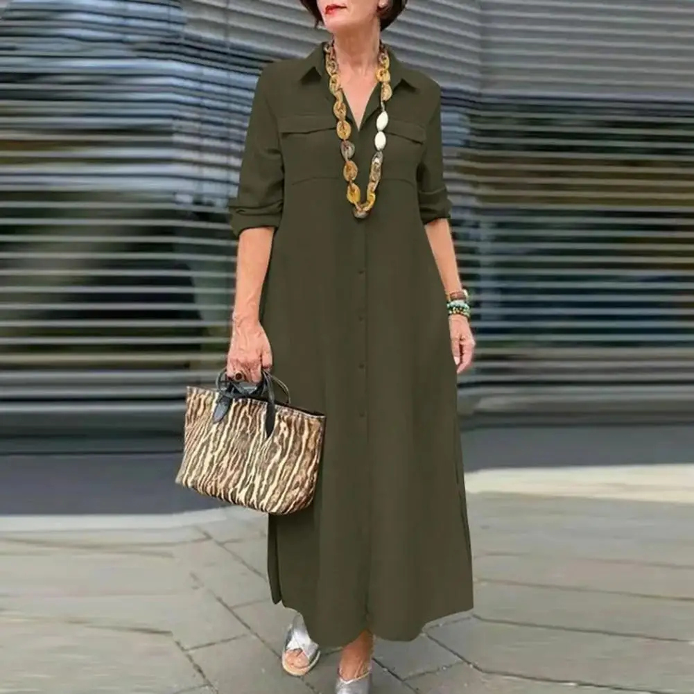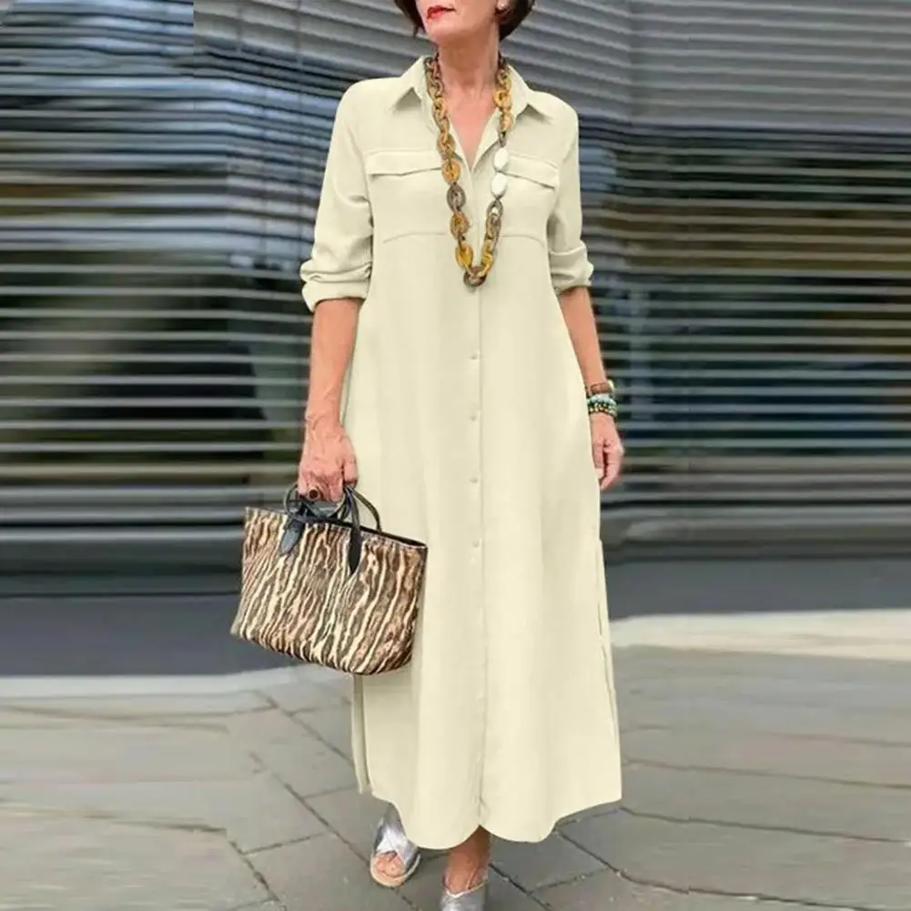 Women Dress Turn-down Collar Loose Solid Color Long Sleeve Single-breasted A-line Chest Pocket Soft Breathable Ankle Length Spring Fall Maxi Dress