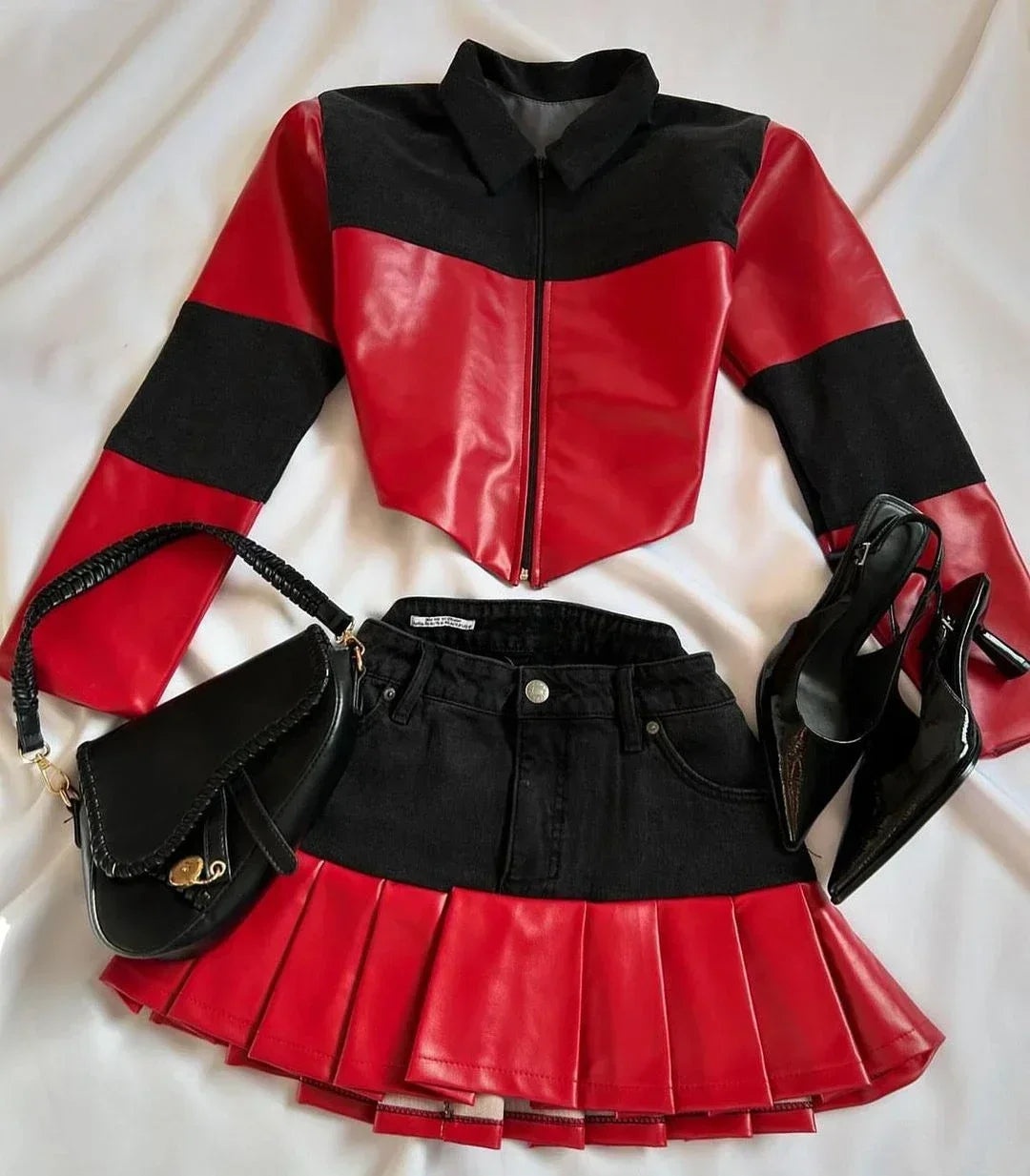 DERMEARNE Y2K Women Streetwear Heart Shape Leather Outfit Two Piece Harajuku Gothic Jacket Cropped Denim Patchwork Pleated Mini Skirt Suit