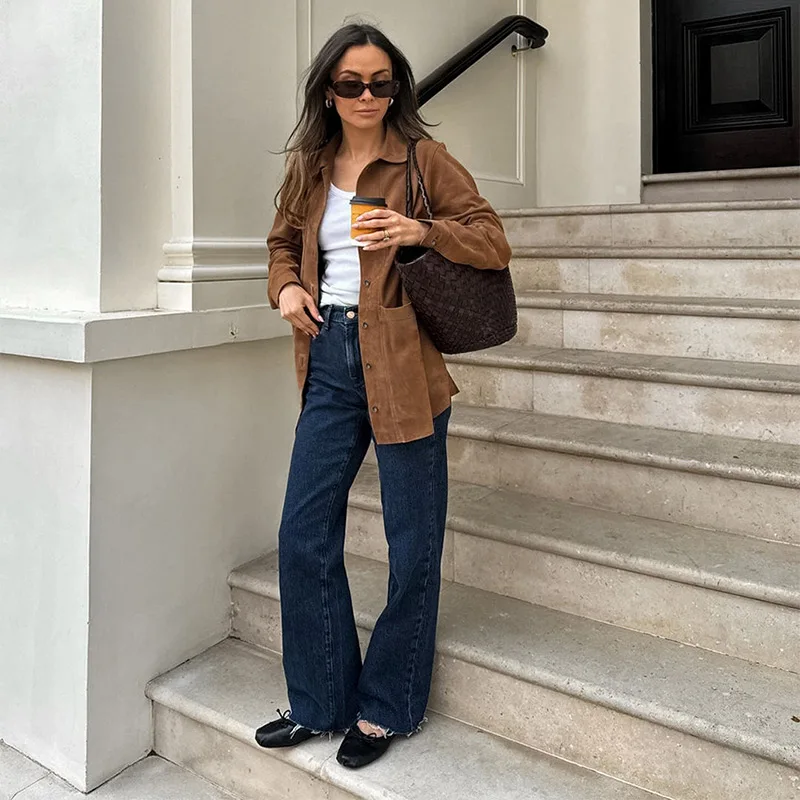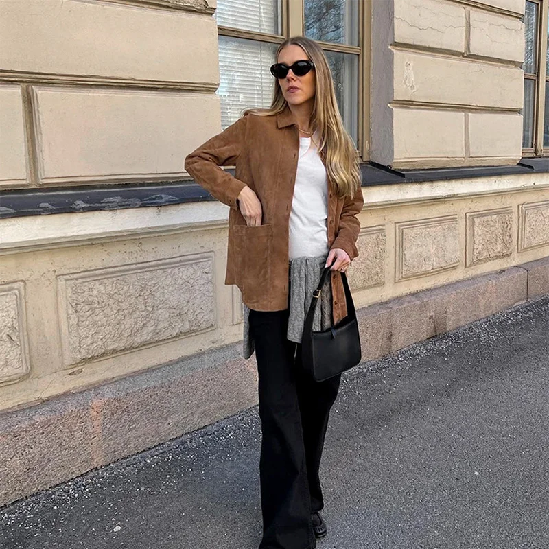 DERMEARNE Fashion Brown With Double Pocket Blazer Jacket Woman Single Breasted Long Sleeve Short Coat 2024 Lady Autumn High Street Outwear
