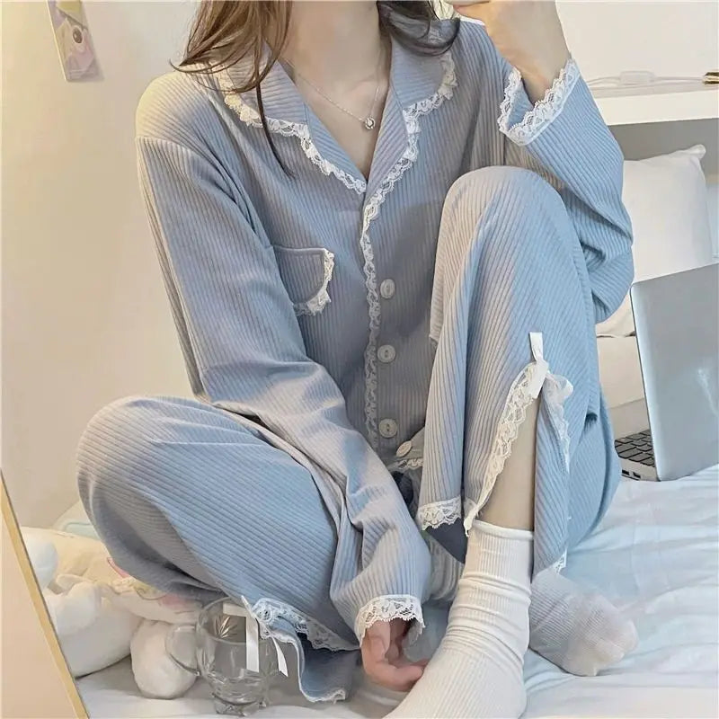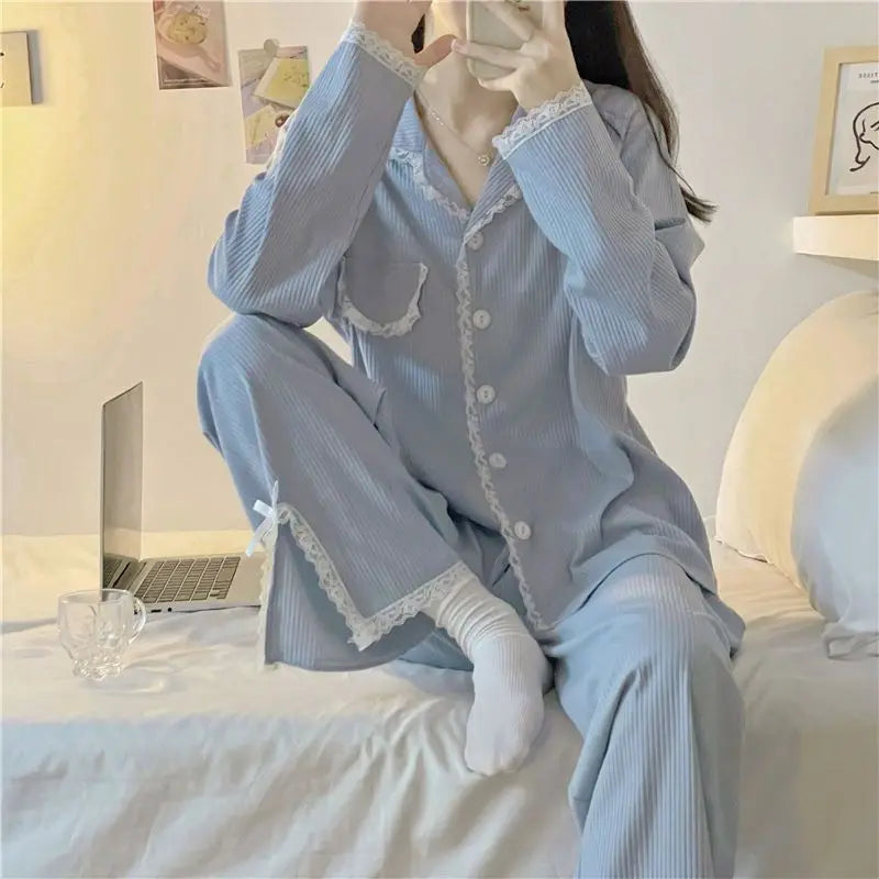 DERMEARNE Lace Women's Pajamas Autumn Sleepwear Long Sleeve Pants Sets for Women 2 Pieces Korean Night Wears Solid Split Home Suit 2025