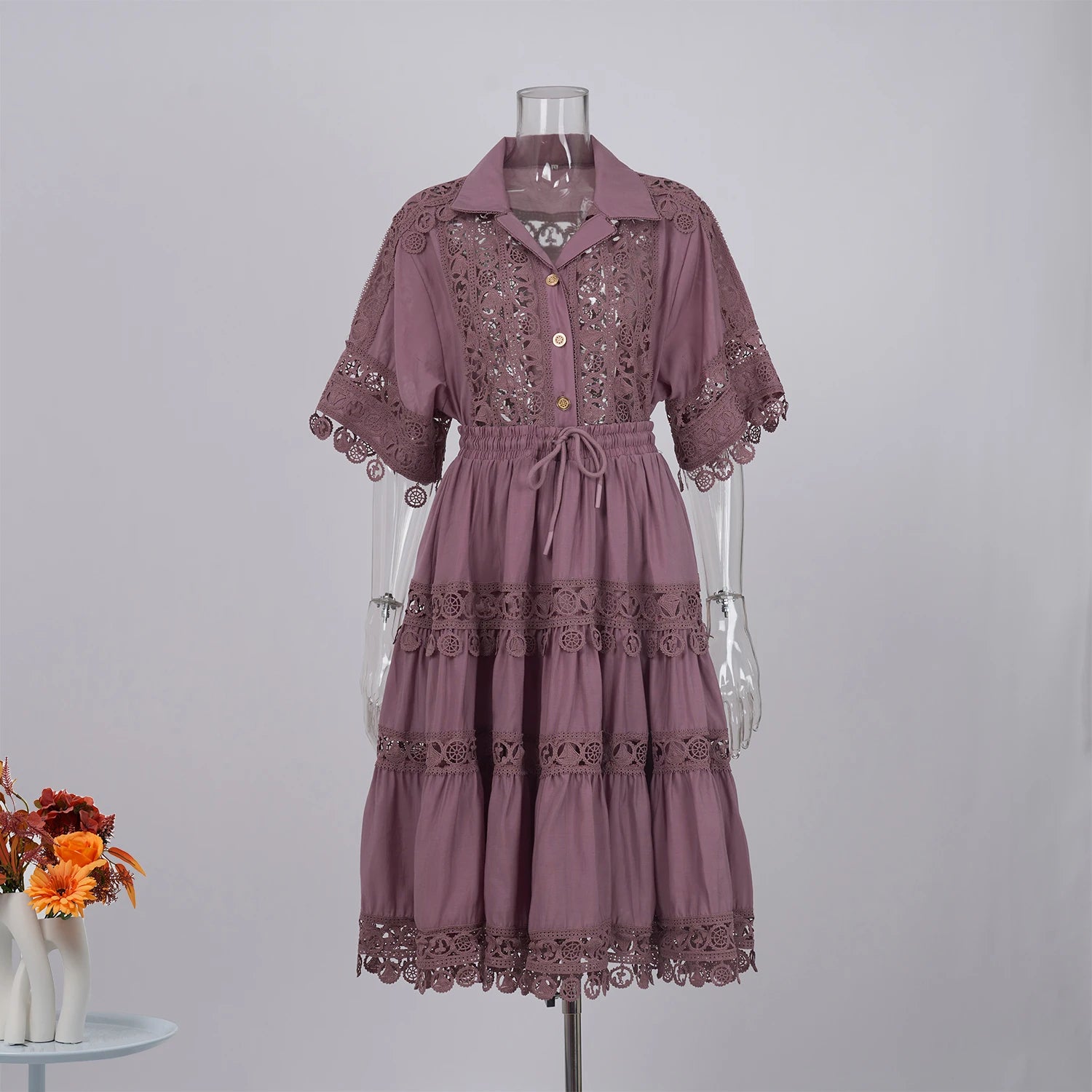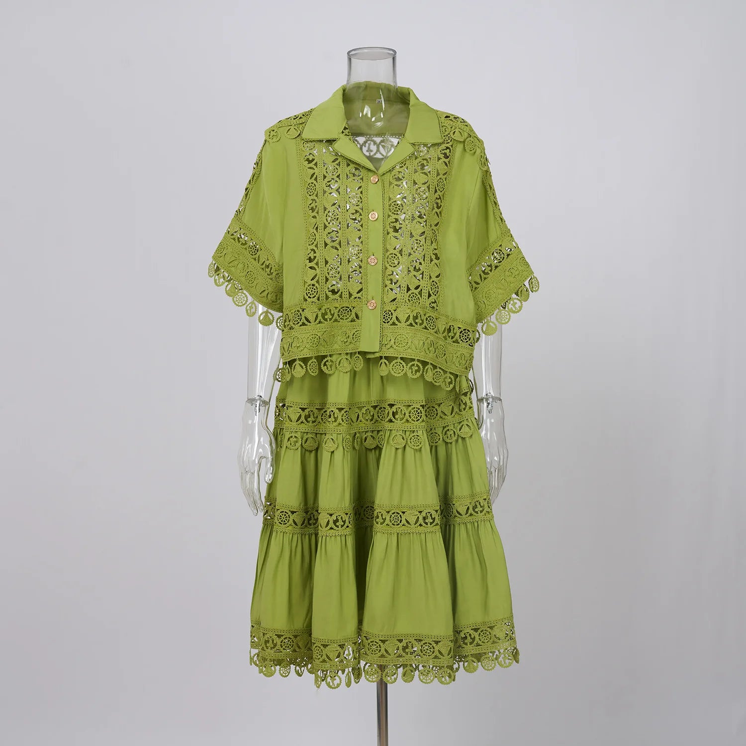 DERMEARNE Luxury Hollow Out Dress Two Piece Set Women's 2025 Summer Holiday Embroidered Lace Jackets White Tops Pleated Short Skirts Suits