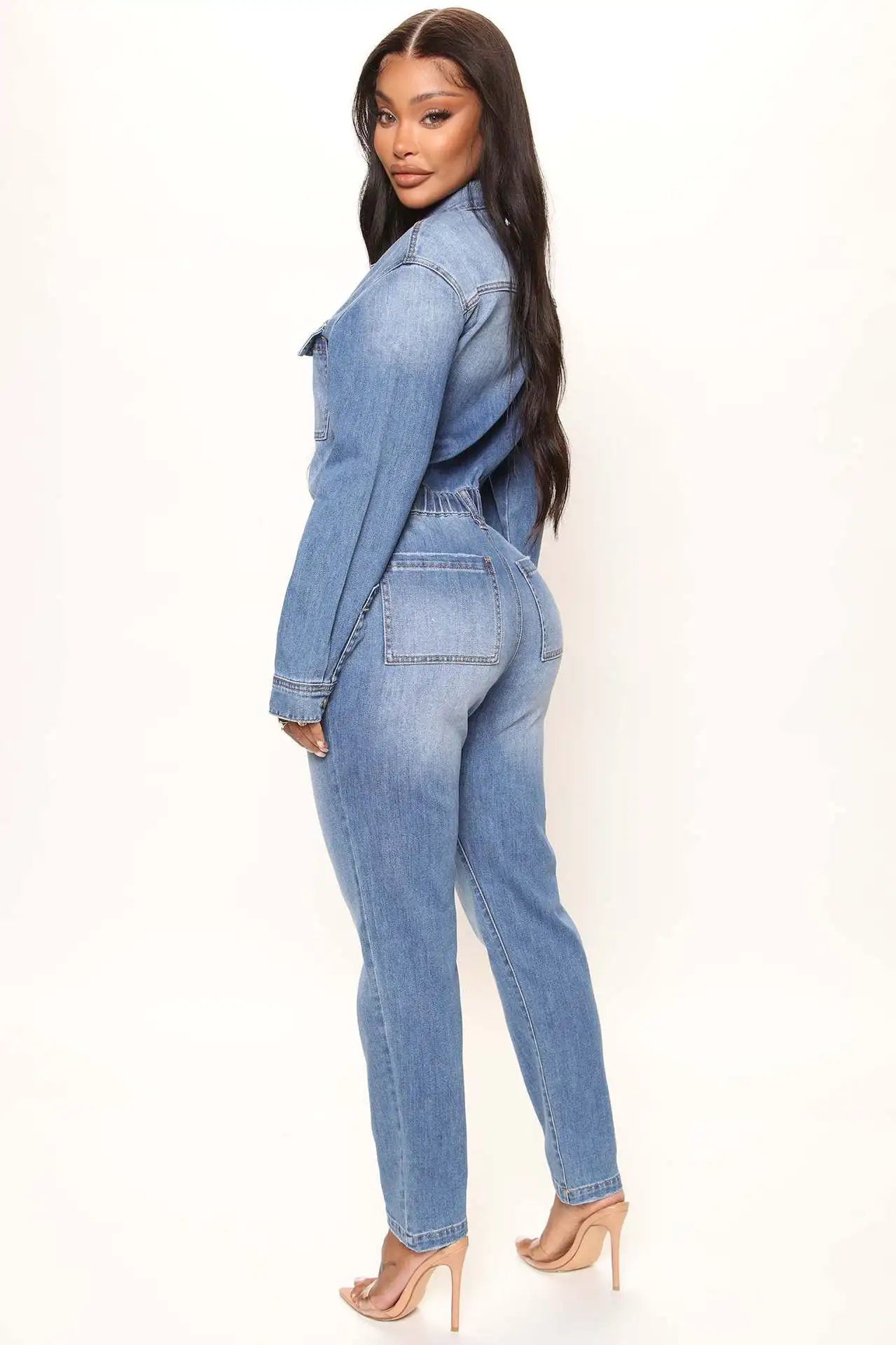 DERMEARNE Women Jeans Jumpsuits One Piece Overalls Single Breasted Denim Rompers Solid Pencil Pants Pockets High Street Slim Fit 2024