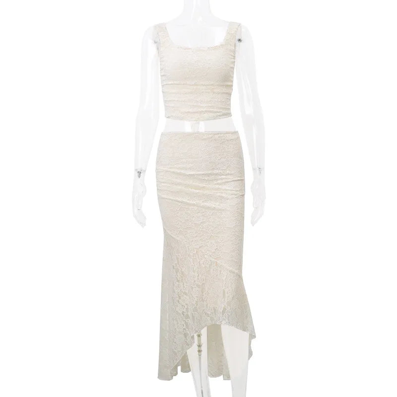 Elegant Lace Two Piece Set Women Irregular Long Skirt And Corset Top French Style Bodycon Dress Matching Sets
